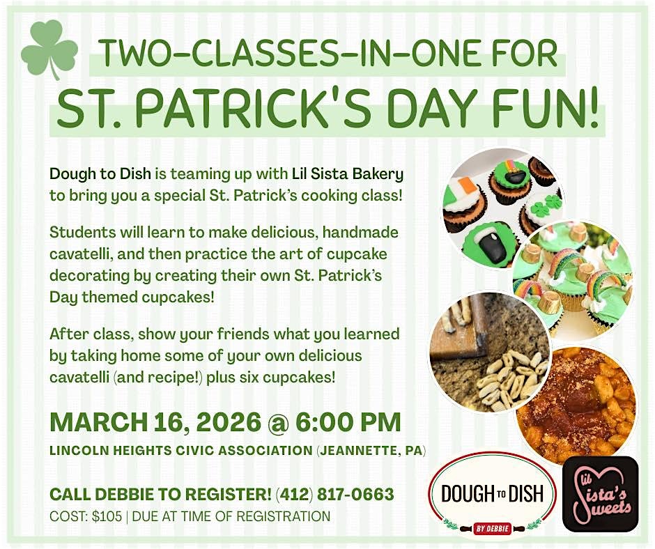 by admin24Feb St. Patty’s Day Cooking and Decorating Class at Lincoln Heights Civic Association – Jeannette, PA St. Patty’s Day Cooking and Decorating Class at Lincoln Heights Civic Association – Jeannette, PA 2 2 people viewed this event. Students will learn to make delicious, homemade cavatelli as well as practice the art of cupcake decorating. Take home goodies for everyone! Tickets-RSVP Link Date And Time Monday, March 16th, 2026 06:00 PM (PST) Venue Lincoln Heights Civic Association Location 42 Millersdale Road, Jeannette, PA 15644 Event Types Food & Drink Event Category Pennsylvania Share With Friends Facebook Twitter Linkedin Xing Pinterest Share This Post: