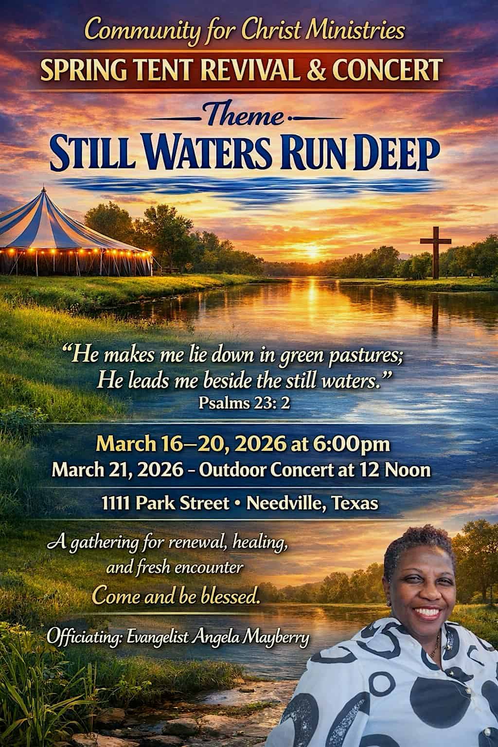 by admin14Feb STILL WATERS RUN DEEP – SPRING TENT REVIVAL at 8705 Park St – Needville, TX STILL WATERS RUN DEEP – SPRING TENT REVIVAL at 8705 Park St – Needville, TX 2 2 people viewed this event. Get ready to dive deep into the spiritual waters of our Spring Tent Revival – it’s gonna be a powerful experience you won’t want to miss! Tickets-RSVP Link Date And Time Monday, March 16th, 2026 11:00 PM (PST) Venue 8705 Park St Location 8705 Park Street, Needville, TX 77461 Event Types Concert or Performance Event Category Texas Share With Friends Facebook Twitter Linkedin Xing Pinterest Share This Post: