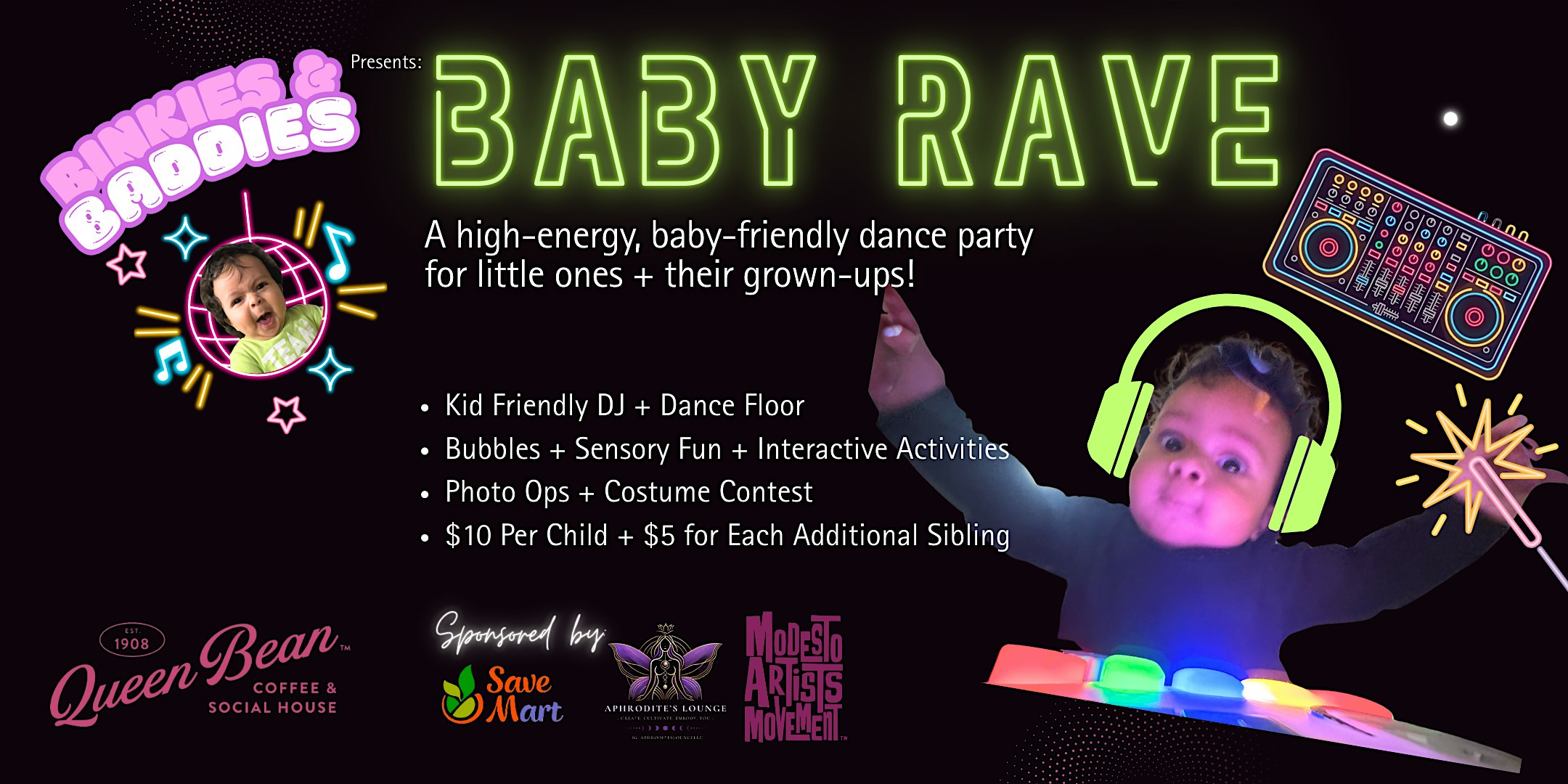 by admin13Feb ✨ BABY RAVE ✨ A high-energy, baby-friendly dance party at The Queen Bean Coffee & Social House – Modesto, CA ✨ BABY RAVE ✨ A high-energy, baby-friendly dance party at The Queen Bean Coffee & Social House – Modesto, CA 2 2 people viewed this event. Baby Rave is a fun, baby-safe daytime dance party with a DJ, bubbles, sensory activities, & photo ops designed for moms & little ones. Tickets-RSVP Link Date And Time Tuesday, March 17th, 2026 06:00 PM (PST) Venue The Queen Bean Coffee & Social House Location 1126 14th Street, Modesto, CA 95354 Event Types Party or Social Gathering Event Category California Share With Friends Facebook Twitter Linkedin Xing Pinterest Share This Post: