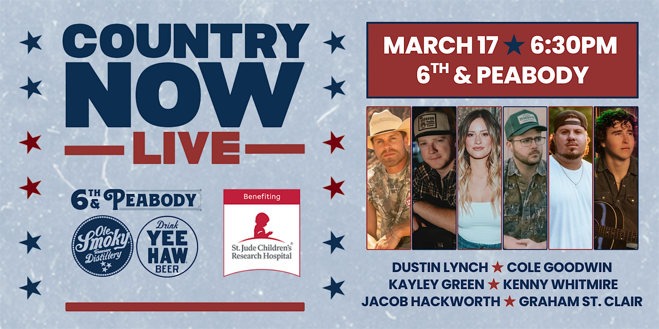 by admin27Feb Country Now Live at 6th & Peabody, 6th Avenue South, Nashville, TN, USA – Nashville, TN Country Now Live at 6th & Peabody, 6th Avenue South, Nashville, TN, USA – Nashville, TN 1 1 people viewed this event. Join Country Now for an unforgettable night of live country music benefiting St. Jude. Tickets-RSVP Link Date And Time Tuesday, March 17th, 2026 06:00 PM (PST) Venue 6th & Peabody, 6th Avenue South, Nashville, TN, USA Location 423 6th Avenue South, Nashville, TN 37203 Event Types Concert or PerformanceMusic Event Category NashvilleTennessee Share With Friends Facebook Twitter Linkedin Xing Pinterest Share This Post: