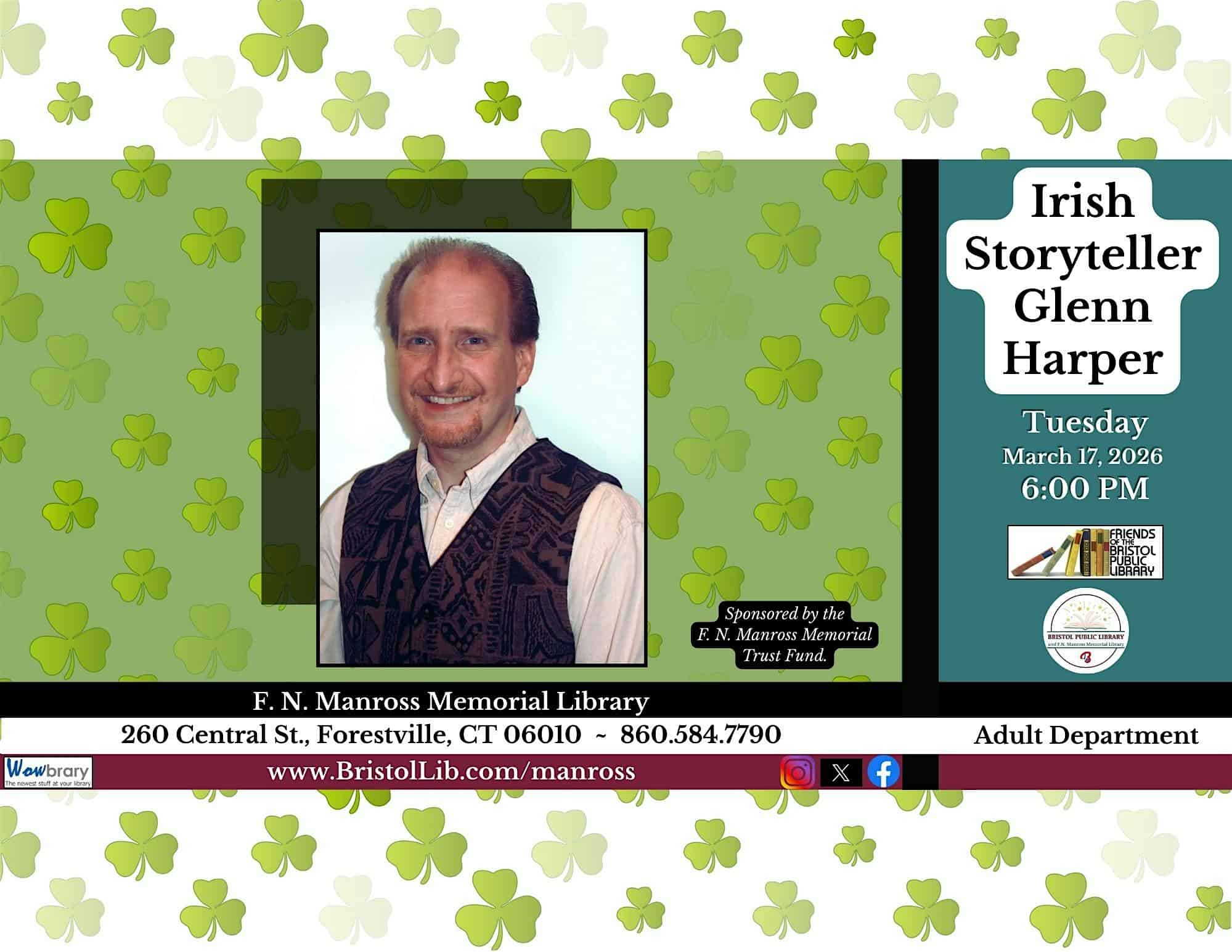 by admin14Feb Irish Storyteller Glenn Harper at Manross Memorial Library – Bristol, CT Irish Storyteller Glenn Harper at Manross Memorial Library – Bristol, CT 1 1 people viewed this event. Celebrate Saint Patrick’s Day with us! Tickets-RSVP Link Date And Time Tuesday, March 17th, 2026 10:00 PM (PST) Venue Manross Memorial Library Location 260 Central Street, Bristol, CT 6010 Event Types Concert or PerformancePerforming & Visual Arts Event Category Connecticut Share With Friends Facebook Twitter Linkedin Xing Pinterest Share This Post: