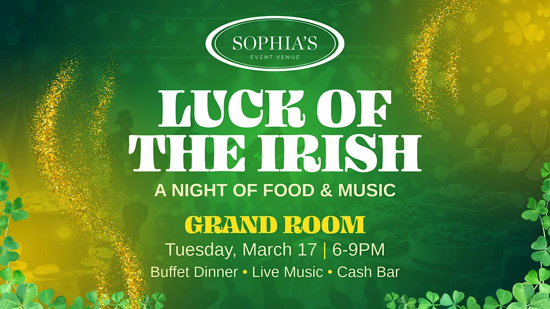 by admin27Feb Luck of the Irish: A Night of Dinner & Music at Sophia’s Event Venue – Coraopolis, PA Luck of the Irish: A Night of Dinner & Music at Sophia’s Event Venue – Coraopolis, PA 1 1 people viewed this event. St. Patrick’s Day buffet, live music & cocktails! March 17, doors 5:30PM. $34.95. Celebrate the Luck of the Irish with us! Tickets-RSVP Link Date And Time Tuesday, March 17th, 2026 06:00 PM (PST) Venue Sophia's Event Venue Location 318 Forest Grove Road, Coraopolis, PA 15108 Event Types Food & Drink Event Category Pennsylvania Share With Friends Facebook Twitter Linkedin Xing Pinterest Share This Post: