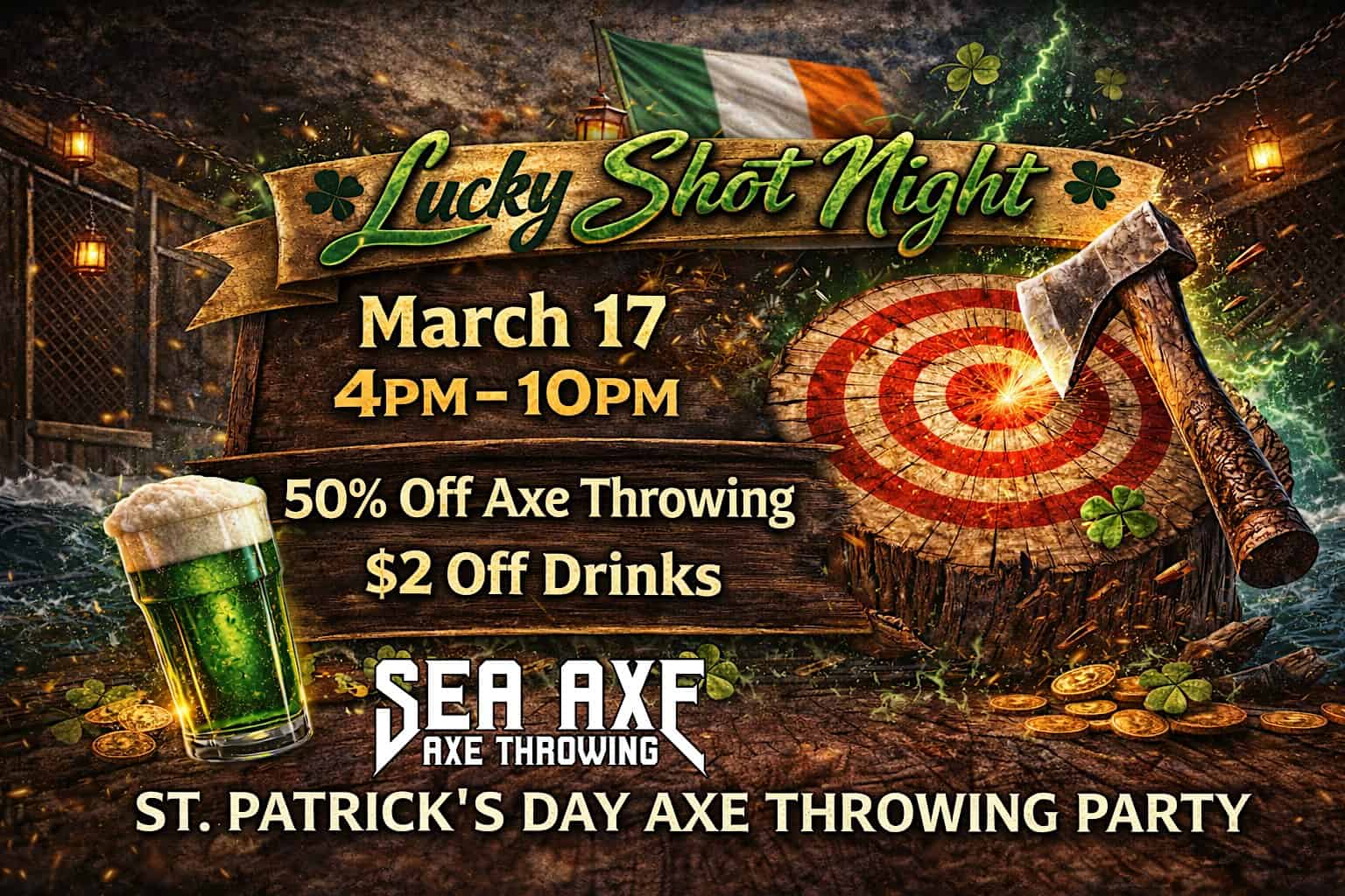 by admin23Feb Lucky Shot Night – St. Patrick’s Day Axe Throwing Party at SEA AXE – Auburn, WA Lucky Shot Night – St. Patrick’s Day Axe Throwing Party at SEA AXE – Auburn, WA 2 2 people viewed this event. Lucky Shot Night! March 17, 4–10PM. Half off axe throwing and $2 off drinks. Wear green, hit bullseyes, win prizes. Tickets-RSVP Link Date And Time Tuesday, March 17th, 2026 04:00 PM (PST) Venue SEA AXE Location 335 East Main Street, Auburn, WA 98002 Event Types Food & DrinkParty or Social Gathering Event Category Washington Share With Friends Facebook Twitter Linkedin Xing Pinterest Share This Post: