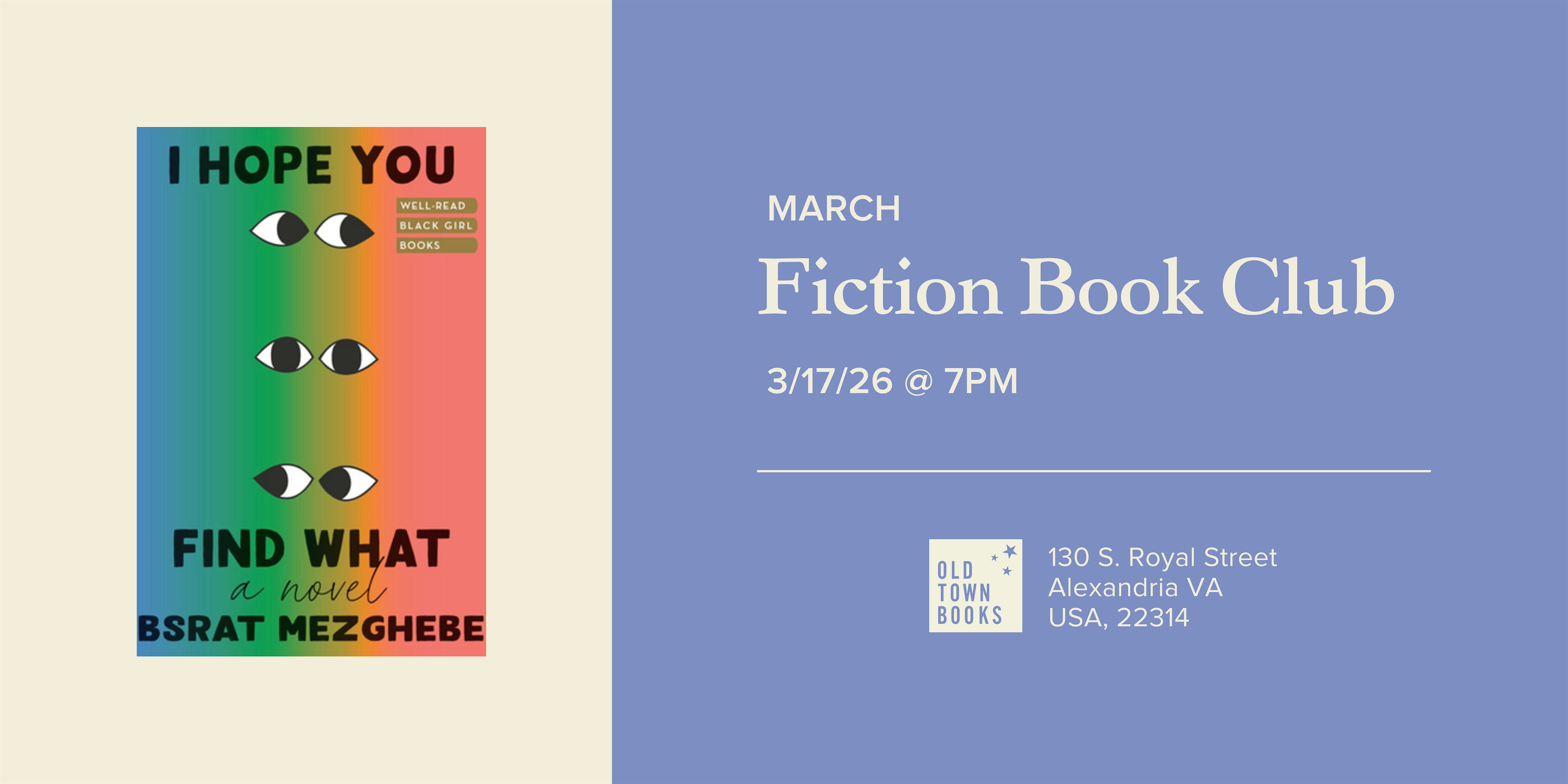 by admin13Feb March Fiction Book Club: I Hope You Find What You’re Looking For at Old Town Books – Alexandria, VA March Fiction Book Club: I Hope You Find What You’re Looking For at Old Town Books – Alexandria, VA 1 1 people viewed this event. Join us as we discuss I Hope You Find What You’re Looking For by Bsrat Mezghebe at our March Fiction Book Club! Tickets-RSVP Link Date And Time Tuesday, March 17th, 2026 11:00 PM (PST) Venue Old Town Books Location 130 South Royal Street, Alexandria, VA 22314 Event Types Party or Social Gathering Event Category Virginia Share With Friends Facebook Twitter Linkedin Xing Pinterest Share This Post:
