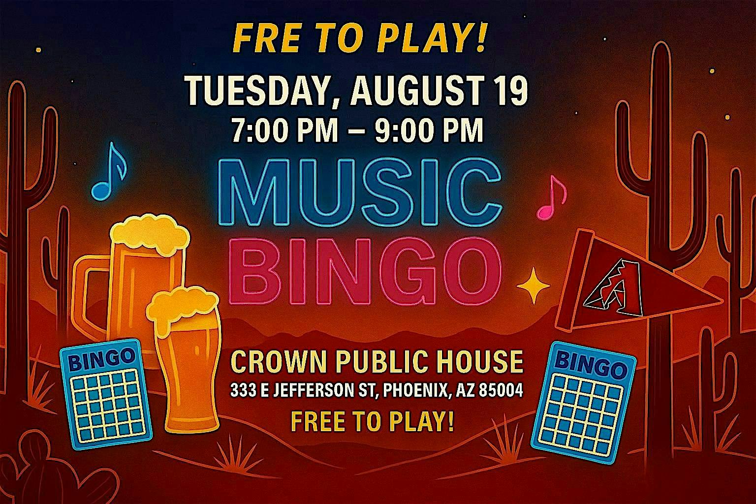 Music Bingo at Crown Public House – Phoenix! at Crown Public House – Phoenix, AZ Music Bingo at Crown Public House – Phoenix! at Crown Public House – Phoenix, AZ 1 1 people viewed this event. Join us for a fun night of Music Bingo at Crown Public House in Phoenix – test your music knowledge and win some awesome prizes! Tickets-RSVP Link Register for event Date And Time Tuesday, March 17th, 2026 @ 07:00 PM Location 333 East Jefferson Street, Phoenix, AZ 85004 Event Types Game or CompetitionMusic Event Category ArizonaPhoenix Share With Friends Facebook Twitter Linkedin Xing Pinterest