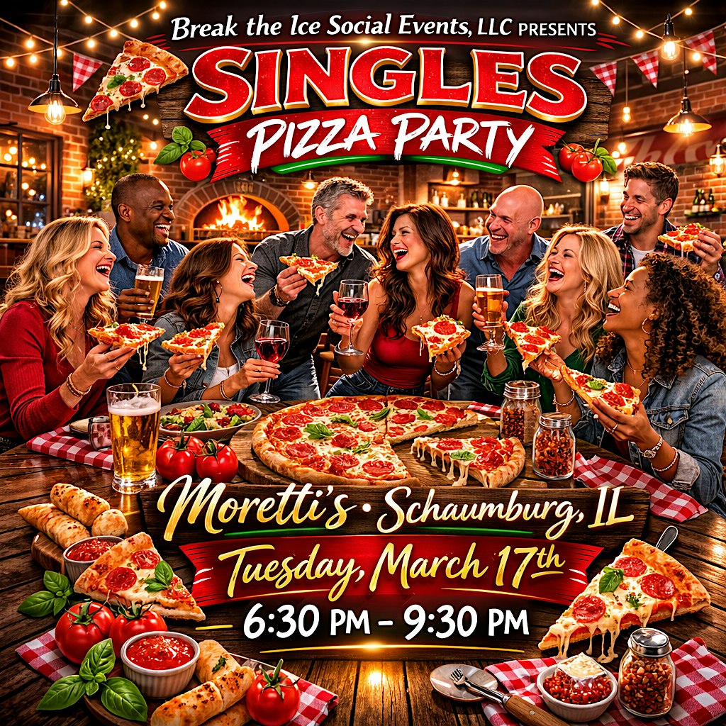 by admin27Feb Singles Social Mixer Pizza Party Schaumburg, IL Moretti’s at Moretti’s Schaumburg – Schaumburg, IL Singles Social Mixer Pizza Party Schaumburg, IL Moretti’s at Moretti’s Schaumburg – Schaumburg, IL 1 1 people viewed this event. These mixers are an excellent opportunity to meet new people for a fun night. Assorted pizzas and soft drinks will be provided. Tickets-RSVP Link Date And Time Tuesday, March 17th, 2026 06:00 PM (PST) Venue Moretti's Schaumburg Location 1893 Walden Office Square, Schaumburg, IL 60173 Event Types Food & DrinkParty or Social Gathering Event Category ChicagoIllinois Share With Friends Facebook Twitter Linkedin Xing Pinterest Share This Post: