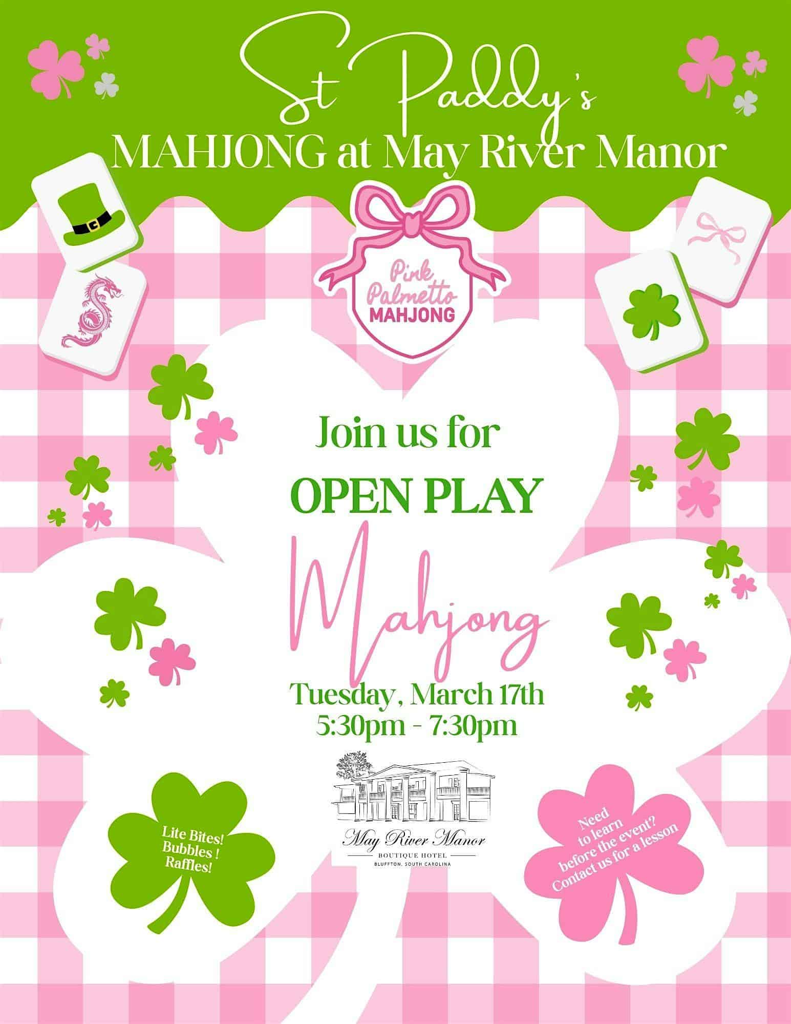 by admin23Feb St. Paddy’s Open Play at May River Manor at May River Manor – Bluffton, SC St. Paddy’s Open Play at May River Manor at May River Manor – Bluffton, SC 1 1 people viewed this event. Come celebrate St.Paddy’s with a little Mahjong Magic! Open Play for all level of players. Lite Bites, Bubbles and fun Raffles Tickets-RSVP Link Date And Time Tuesday, March 17th, 2026 @ 05:00 PM Location 155 Old Miller Road, Bluffton, SC 29910 Event Types OtherParty or Social Gathering Event Category South Carolina Share With Friends Facebook Twitter Linkedin Xing Pinterest Share This Post:
