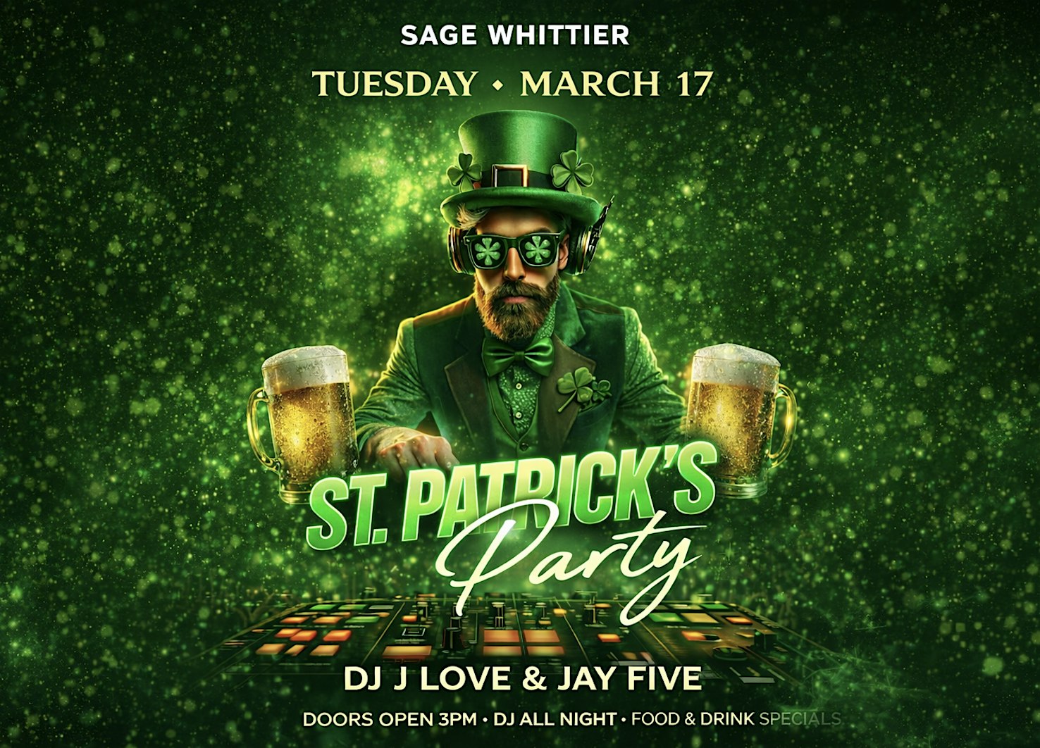 by admin27Feb ST. PATRICK’S DAY PARTY AT SAGE WHITTIER at Sage Restaurant & Lounge – Whittier, CA ST. PATRICK’S DAY PARTY AT SAGE WHITTIER at Sage Restaurant & Lounge – Whittier, CA 1 1 people viewed this event. Join us Tuesday, March 17, for Irish eats, green beer, whiskey & live Dj’s! Wear green & get ready to celebrate with our bartenders & DJ’S! Tickets-RSVP Link Date And Time Tuesday, March 17th, 2026 03:00 PM (PST) Venue Sage Restaurant & Lounge Location 6511 Greenleaf Avenue, Whittier, CA 90601 Event Types MusicParty or Social Gathering Event Category CaliforniaLos Angeles Share With Friends Facebook Twitter Linkedin Xing Pinterest Share This Post: