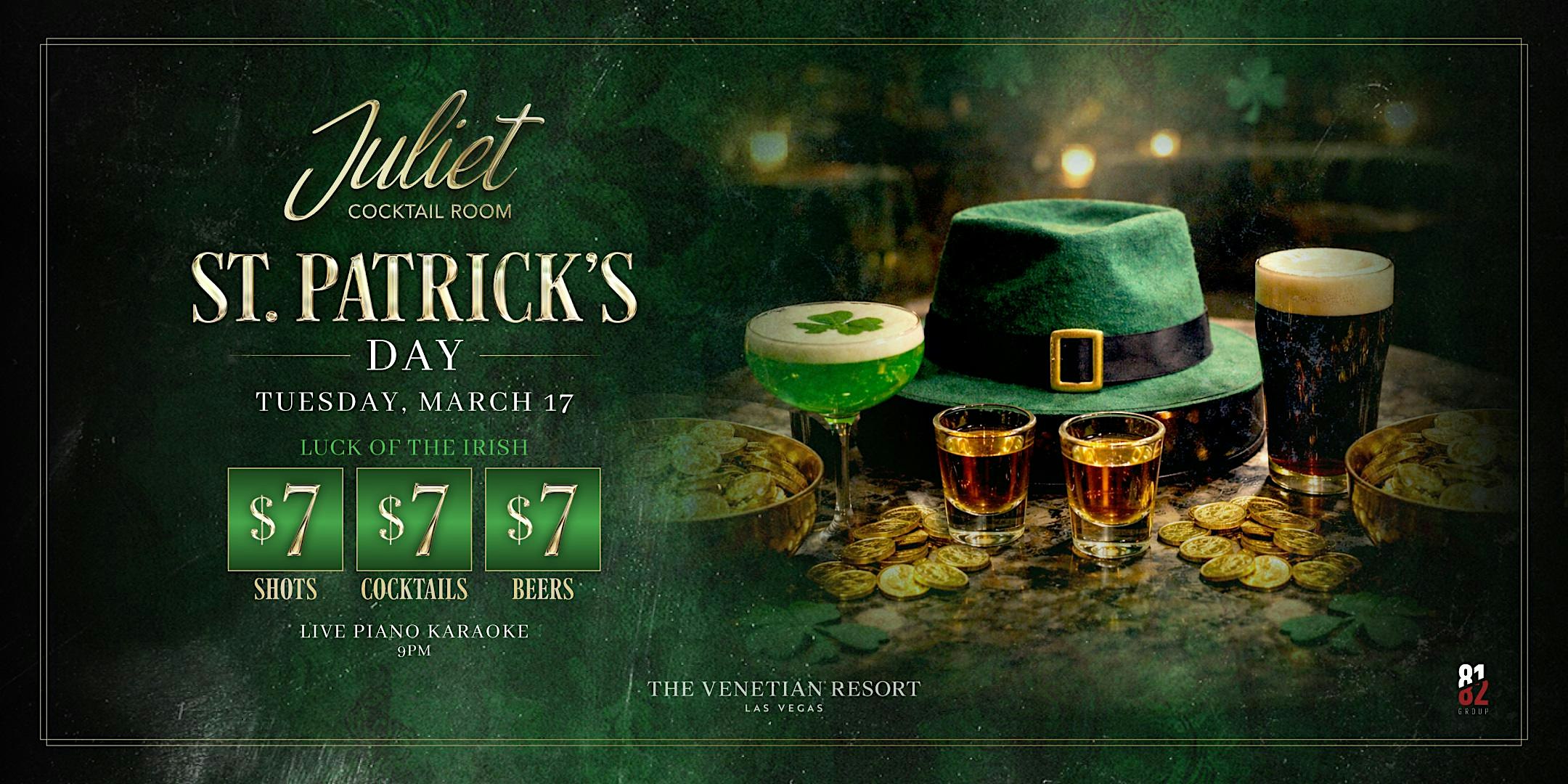by admin27Feb St. Patrick’s Day at Juliet Cocktail Room – Las Vegas, NV St. Patrick’s Day at Juliet Cocktail Room – Las Vegas, NV 1 1 people viewed this event. St. Patrick’s Day! Piano Karaoke & $7 Green Beer, $7 Irish Whiskey shots, and a $7 Irish Whiskey cocktail all night long. Tickets-RSVP Link Date And Time Tuesday, March 17th, 2026 @ 03:00 PM Location 3355 South Las Vegas Boulevard, Las Vegas, NV 89109 Event Types Party or Social GatheringSeasonal & Holiday Event Category Las VegasNevada Share With Friends Facebook Twitter Linkedin Xing Pinterest Share This Post: