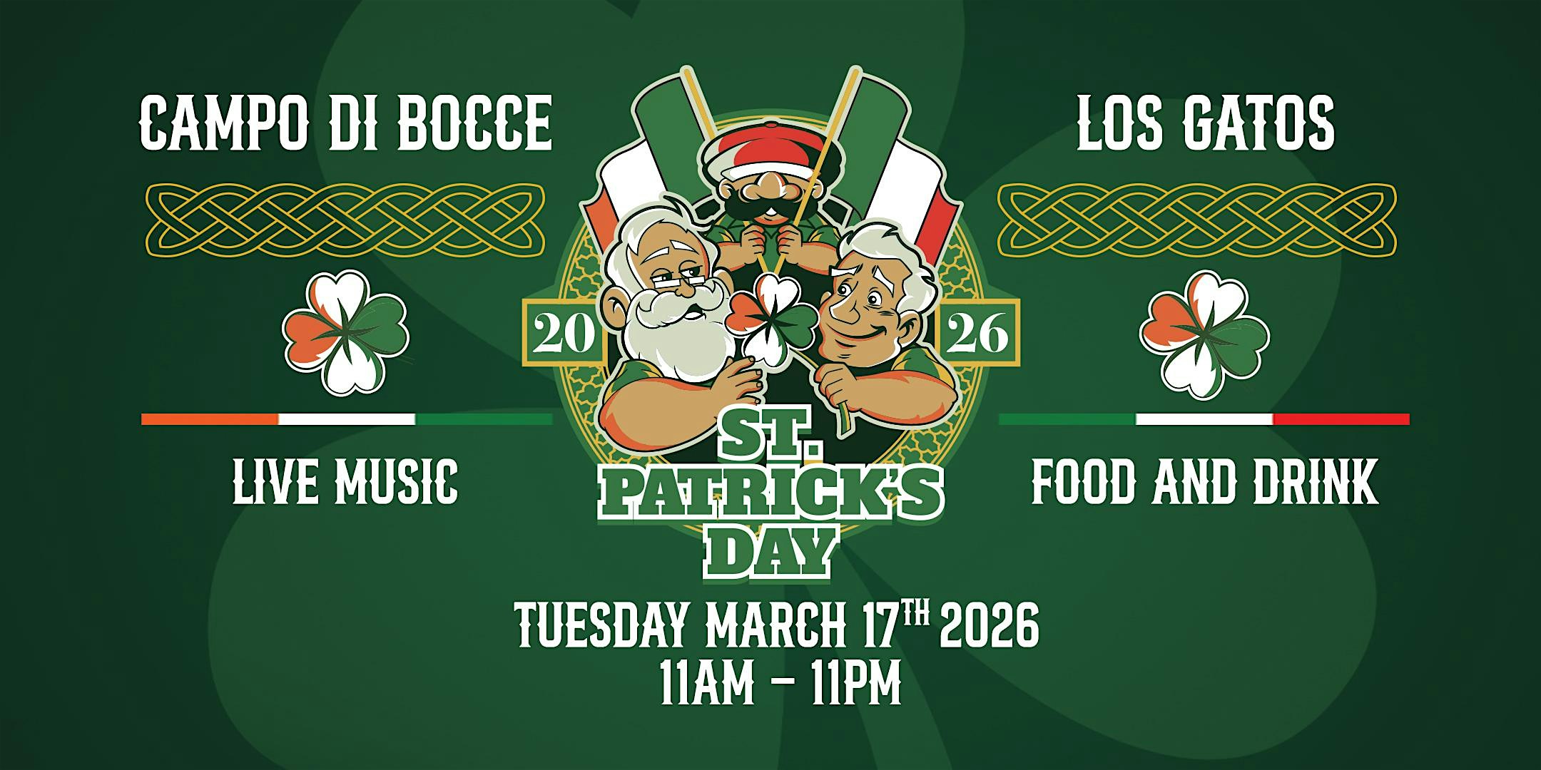 by admin13Feb St. Patrick’s Day at Campo di Bocce of Los Gatos – Los Gatos, CA St. Patrick’s Day at Campo di Bocce of Los Gatos – Los Gatos, CA 2 2 people viewed this event. Celebrate St. Patrick’s Day with us and enjoy a day filled with green beer, Irish music, and good times! Tickets-RSVP Link Date And Time Tuesday, March 17th, 2026 06:00 PM (PST) Venue Campo di Bocce of Los Gatos Location 565 University Avenue, Los Gatos, CA 95032 Event Types Party or Social GatheringSeasonal & Holiday Event Category CaliforniaSan Jose Share With Friends Facebook Twitter Linkedin Xing Pinterest Share This Post: