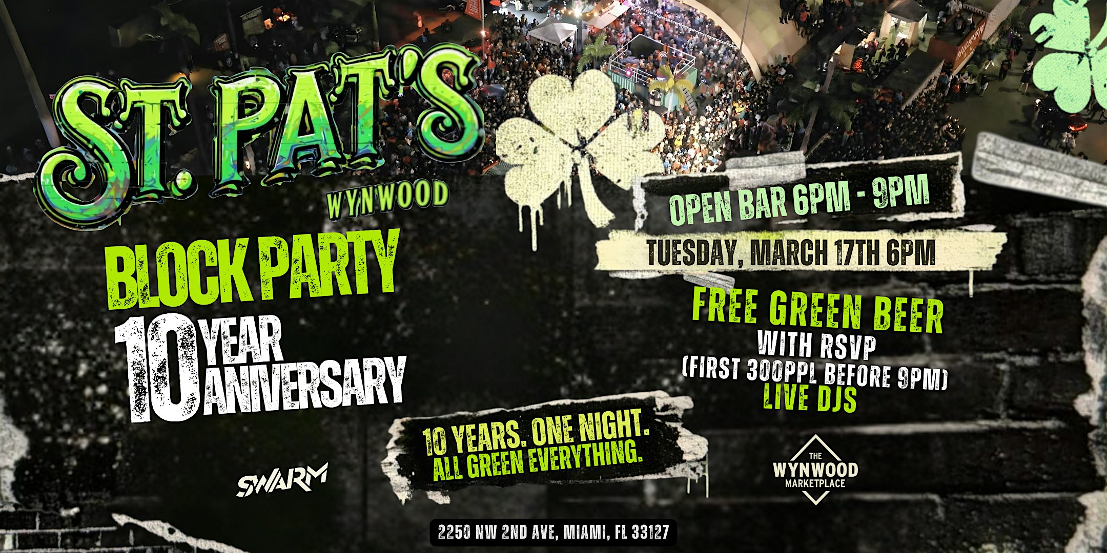 by admin13Feb St. Patrick’s Day Wynwood Block Party 2026 – THE BLOCK PARTY IS BACK at The Wynwood Marketplace – Miami, FL St. Patrick’s Day Wynwood Block Party 2026 – THE BLOCK PARTY IS BACK at The Wynwood Marketplace – Miami, FL 2 2 people viewed this event. Miami’s Biggest St. Patrick’s Day Block Party Returns to Wynwood Tickets-RSVP Link Date And Time Tuesday, March 17th, 2026 10:00 PM (PST) Venue The Wynwood Marketplace Location 2250 NW 2nd Ave, Miami, FL 33127 Event Types Party or Social GatheringSeasonal & Holiday Event Category FloridaMiami Share With Friends Facebook Twitter Linkedin Xing Pinterest Share This Post: