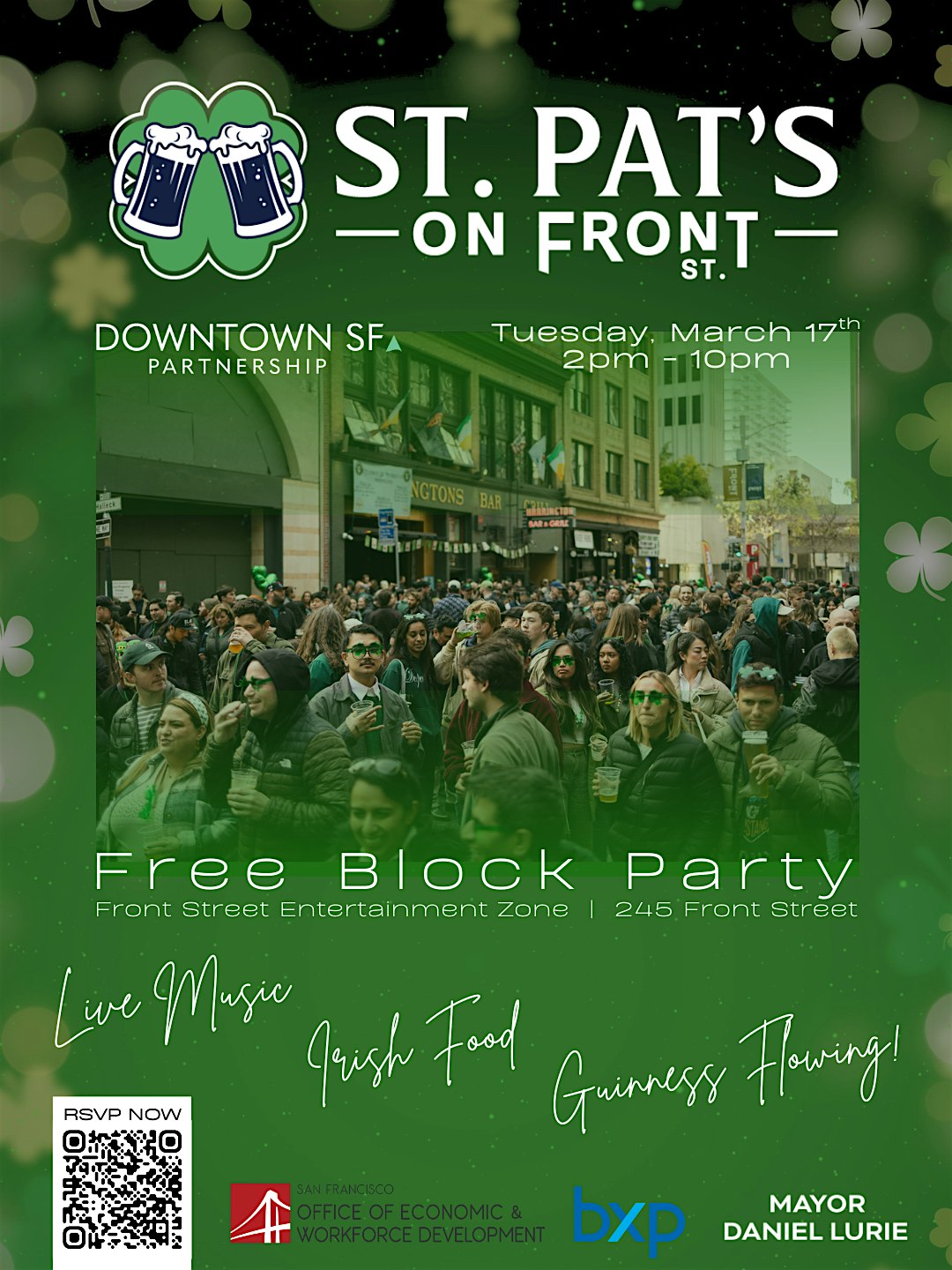 by admin27Feb St. Pat’s on Front Street *FREE* Block Party at 245 Front St – San Francisco, CA St. Pat’s on Front Street *FREE* Block Party at 245 Front St – San Francisco, CA 1 1 people viewed this event. Front Street will be open to revelers on Tuesday, March 17th as the Front Street Entertainment Zone transforms into the ultimate Irish party Tickets-RSVP Link Date And Time Tuesday, March 17th, 2026 @ 02:00 PM Location 245 Front Street, San Francisco, CA 94111 Event Types Party or Social GatheringSeasonal & Holiday Event Category CaliforniaSan Francisco Share With Friends Facebook Twitter Linkedin Xing Pinterest Share This Post: