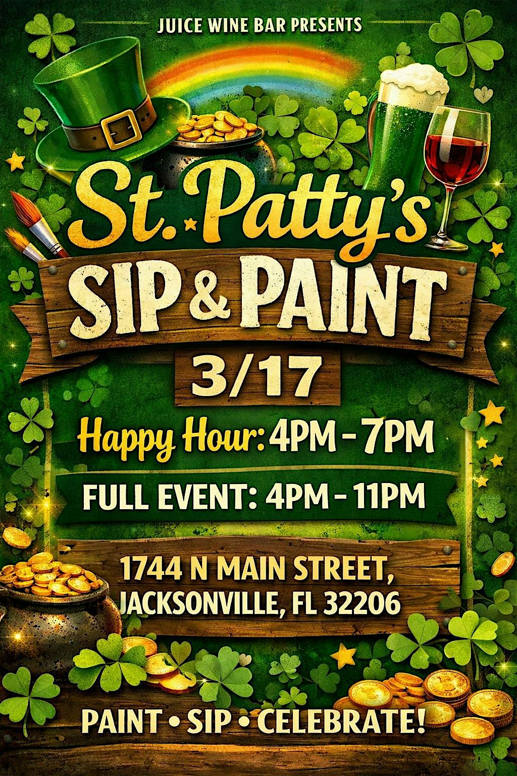 St. Patty’s Sip & Paint at 1744 N Main St – Jacksonville, FL St. Patty’s Sip & Paint at 1744 N Main St – Jacksonville, FL 1 1 people viewed this event. Celebrate, sip and paint with us on St.Patty’s Day at Juice Wine Bar. Tickets-RSVP Link Register for event Date And Time Tuesday, March 17th, 2026 @ 04:00 PM Location 1744 North Main Street, Jacksonville, FLĀ 32206 Event Types Class, Training, or WorkshopFood & Drink Event Category FloridaJacksonville Share With Friends Facebook Twitter Linkedin Xing Pinterest