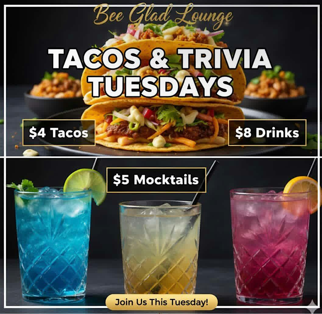 by admin24Feb Tacos & Trivia Tuesday at Bee Glad Lounge – Atlanta, GA Tacos & Trivia Tuesday at Bee Glad Lounge – Atlanta, GA 2 2 people viewed this event. Tacos & Trivia Tuesday at Bee Glad Lounge! Salmon, oyster mushroom & Rotel tacos & more plus we’re taking it back to the “99-2000” trivia! Tickets-RSVP Link Date And Time Tuesday, March 17th, 2026 06:00 PM (PST) Venue Bee Glad Lounge Location 825 McDaniel Street Southwest, Atlanta, GA 30310 Event Types Food & DrinkParty or Social Gathering Event Category AtlantaGeorgia Share With Friends Facebook Twitter Linkedin Xing Pinterest Share This Post: