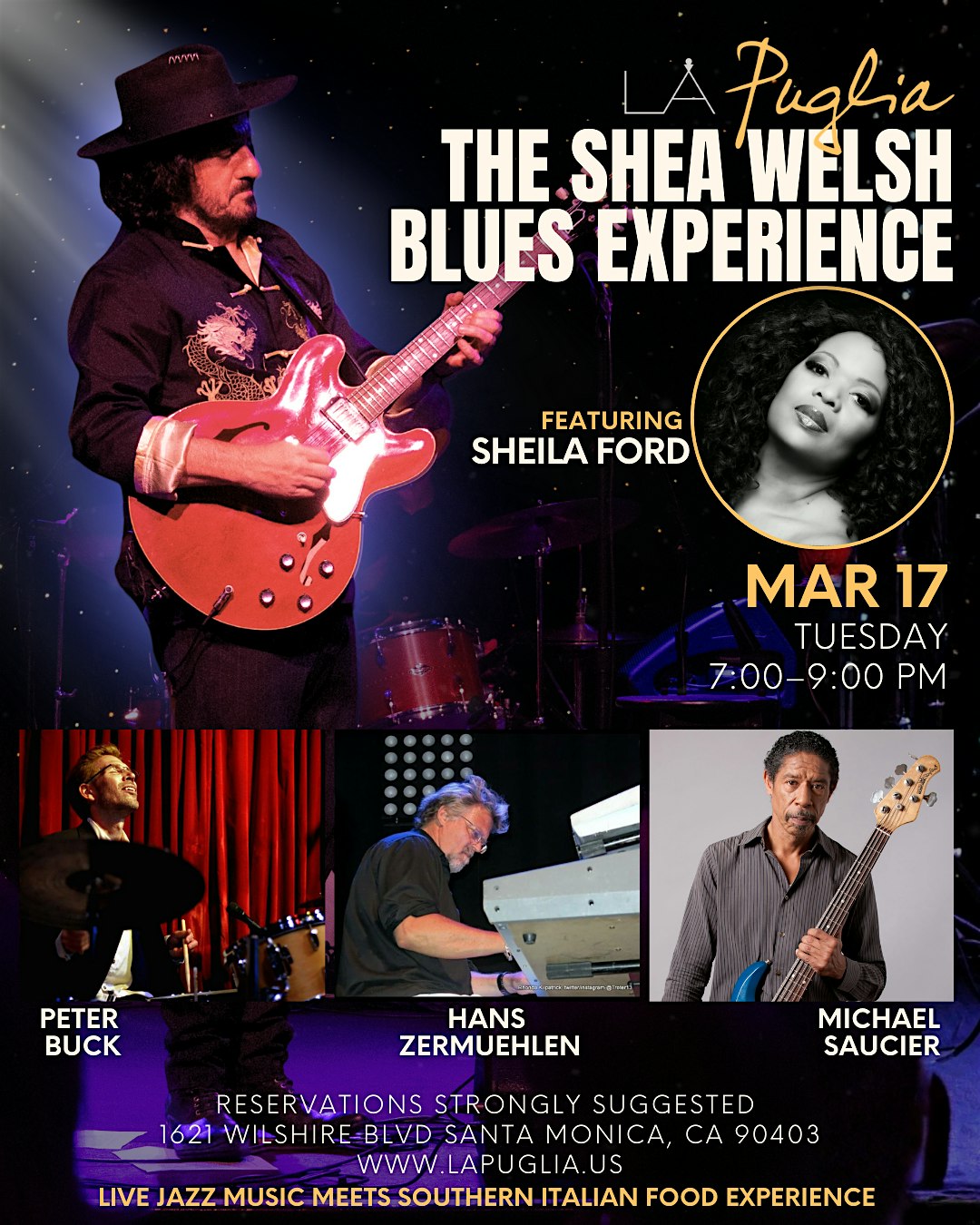 by admin24Feb The Shea Welsh Blues Experience at LA Puglia – Santa Monica, CA The Shea Welsh Blues Experience at LA Puglia – Santa Monica, CA 2 2 people viewed this event. Featuring Sheila Ford on Vocals, Peter Buck on Drums, Michael Saucier on Bass, Hans Zermuehlen on Keys Tickets-RSVP Link Date And Time Tuesday, March 17th, 2026 07:00 PM (PST) Venue LA Puglia Location 1621 Wilshire Boulevard, Santa Monica, CA 90403 Event Types Concert or PerformanceMusic Event Category CaliforniaLos Angeles Share With Friends Facebook Twitter Linkedin Xing Pinterest Share This Post: