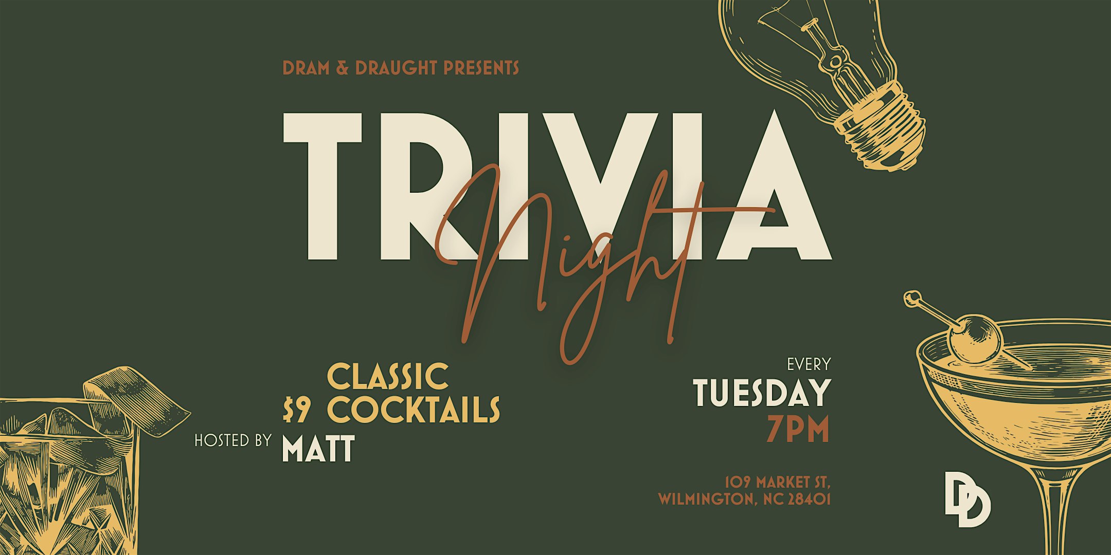 Trivia Night at D&D Wilmington at Dram & Draught – Wilmington, NC Trivia Night at D&D Wilmington at Dram & Draught – Wilmington, NC 1 1 people viewed this event. Get ready to flex those brain muscles and show off your random knowledge at Trivia Night – it’s all fun and games ! Tickets-RSVP Link Register for event Date And Time Tuesday, March 17th, 2026 @ 07:00 PM Location 109 Market Street, Wilmington, NCĀ 28401 Event Types Food & DrinkGame or Competition Event Category North Carolina Share With Friends Facebook Twitter Linkedin Xing Pinterest