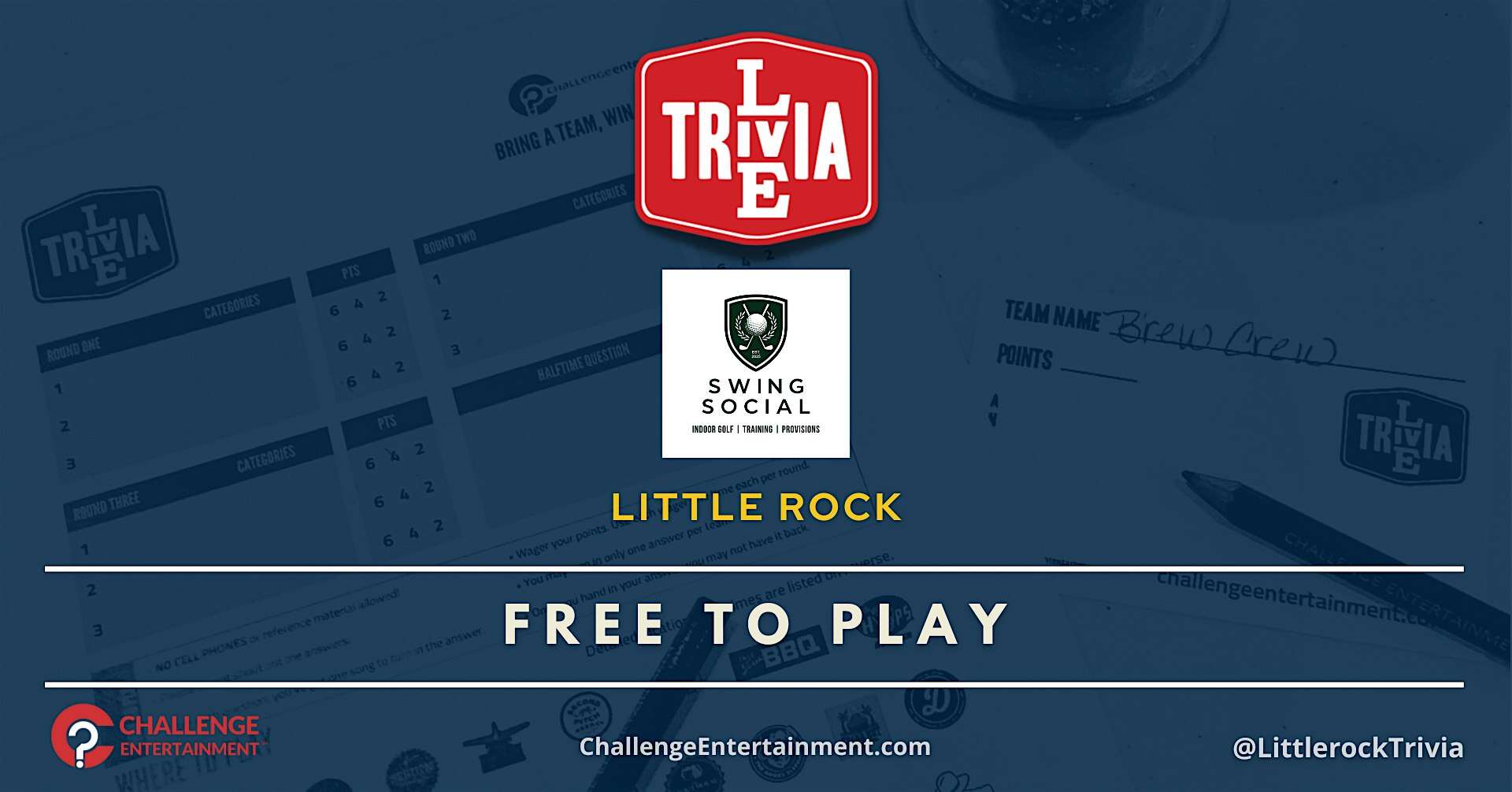 Weekly Live Trivia Nights at Swing Social – Little Rock at Swing Social – Little Rock, AR Weekly Live Trivia Nights at Swing Social – Little Rock at Swing Social – Little Rock, AR 1 1 people viewed this event. Weekly Live Trivia Nights at Swing Social – Little Rock Tickets-RSVP Link Register for event Date And Time Tuesday, March 17th, 2026 @ 07:00 PM Location 11121 North Rodney Parham Road, Little Rock, AR 72212 Event Types Food & DrinkGame or Competition Event Category ArkansasLittle Rock Share With Friends Facebook Twitter Linkedin Xing Pinterest