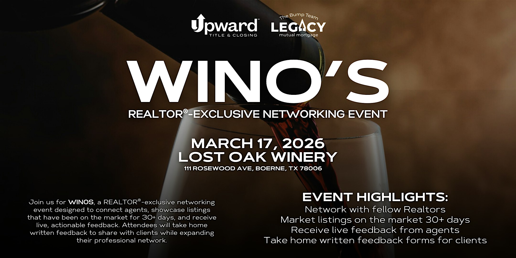by admin27Feb WINOS – We’re Into Networking Opportunities | March at Lost Oak Winery at Lost Oak Cellars – Boerne, TX WINOS – We’re Into Networking Opportunities | March at Lost Oak Winery at Lost Oak Cellars – Boerne, TX 1 1 people viewed this event. Join WINOS, a Realtor-only networking event to showcase 30+ day listings, gain actionable feedback, and grow your network. Tickets-RSVP Link Date And Time Tuesday, March 17th, 2026 12:00 PM (PST) Venue Lost Oak Cellars Location 111 Rosewood Avenue, Boerne, TX 78006 Event Types Food & Drink Event Category Texas Share With Friends Facebook Twitter Linkedin Xing Pinterest Share This Post: