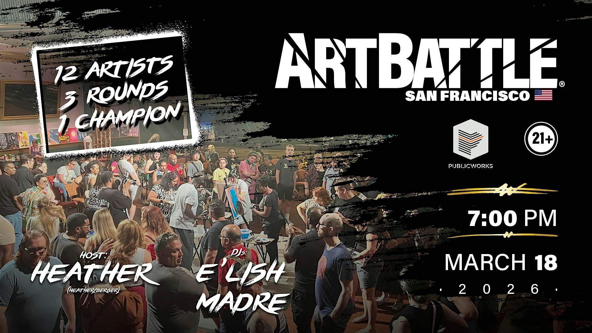 by admin05Mar Art Battle San Francisco – March 18, 2026 at Public Works – San Francisco, CA Art Battle San Francisco – March 18, 2026 at Public Works – San Francisco, CA 2 2 people viewed this event. Paint flies. The room ignites. Art takes the stage at Public Works! Tickets-RSVP Link Date And Time Wednesday, March 18th, 2026 07:00 PM (PST) Venue Public Works Location 161 Erie Street, San Francisco, CA 94103 Event Types Concert or PerformancePerforming & Visual Arts Event Category CaliforniaSan Francisco Share With Friends Facebook Twitter Linkedin Xing Pinterest Share This Post: