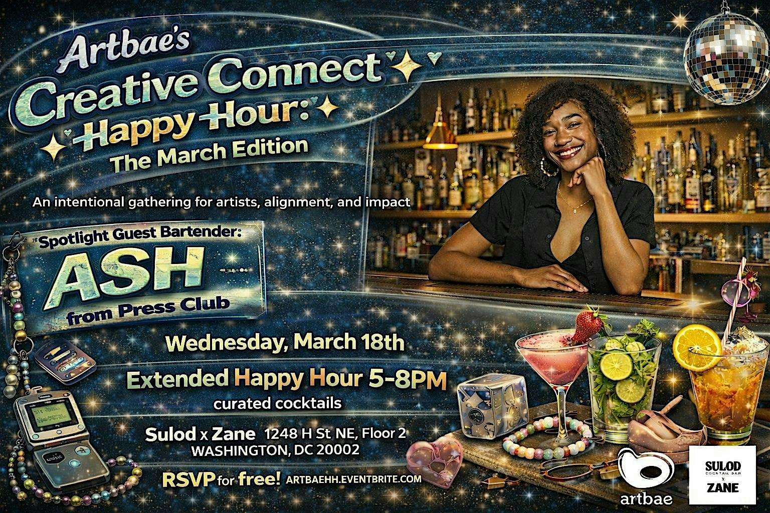 by admin27Feb Artbae’s Creative Connect Happy Hour: Women Who Create (March Edition) at Sulod x ZANE – Washington, DC Artbae’s Creative Connect Happy Hour: Women Who Create (March Edition) at Sulod x ZANE – Washington, DC 1 1 people viewed this event. A Women’s History Month Networking Mixer at the ALL NEW Women-Owned Sulod x ZANE for DMV Creatives! Tickets-RSVP Link Date And Time Wednesday, March 18th, 2026 05:00 PM (PST) Venue Sulod x ZANE Location 1250 H St NE. Fl 2, Washington, DC 20009 Event Types Food & DrinkParty or Social Gathering Event Category Washington DC Share With Friends Facebook Twitter Linkedin Xing Pinterest Share This Post: