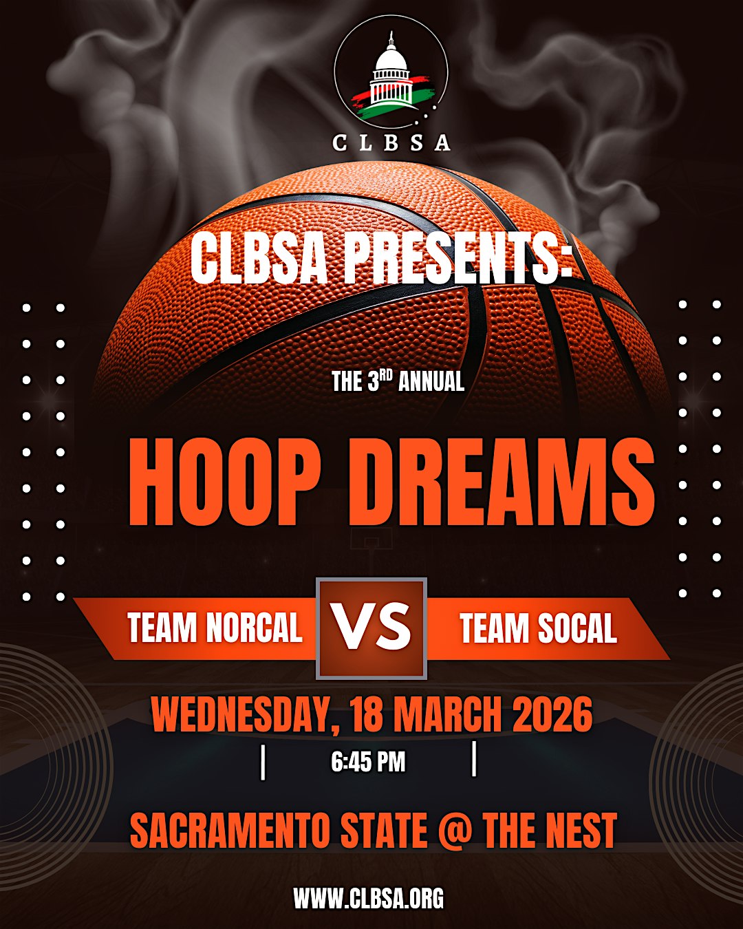 by admin05Mar CLBSA Presents: 3rd Annual Hoop Dream$ at California State University, Sacramento – Sacramento, CA CLBSA Presents: 3rd Annual Hoop Dream$ at California State University, Sacramento – Sacramento, CA 1 1 people viewed this event. CLBSA is excited to invite you to our 3rd Annual staff/advocate basketball game, March 18th! RSVP Here. Tickets are $12. Tickets-RSVP Link Date And Time Wednesday, March 18th, 2026 07:00 PM (PST) Venue California State University, Sacramento Location 6000 J Street, Sacramento, CA 95819 Event Types Concert or PerformanceSports & Fitness Event Category CaliforniaSacramento Share With Friends Facebook Twitter Linkedin Xing Pinterest Share This Post: