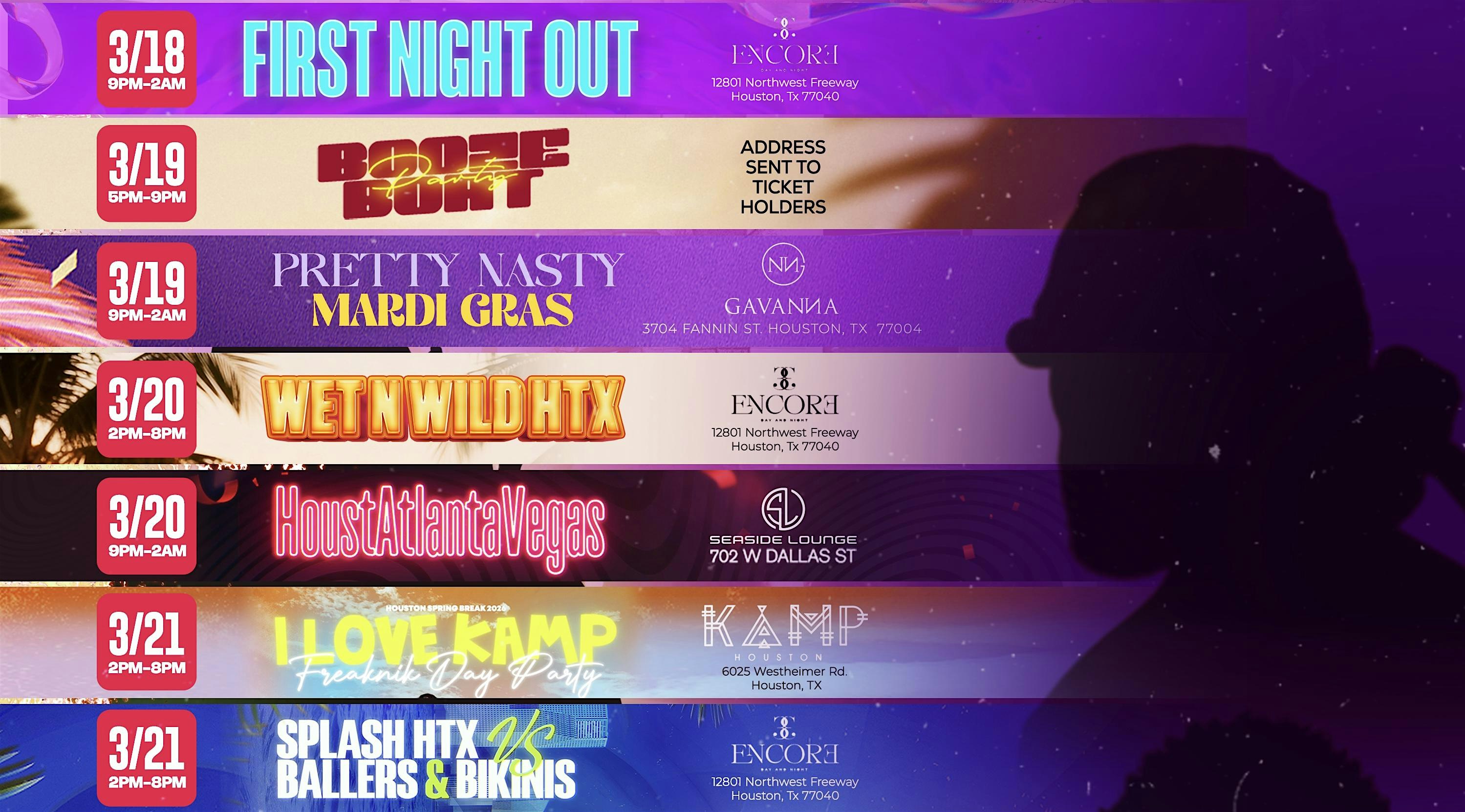 by admin22Feb Houston Spring Break 2026 WEEK 3: RODEO WEEK & BADDIES TAKEOVER at Houston, TX – Houston, TX Houston Spring Break 2026 WEEK 3: RODEO WEEK & BADDIES TAKEOVER at Houston, TX – Houston, TX 1 1 people viewed this event. Welcome to WEEK 3: Catch The Biggest Mega Pool Parties, Rodeo Festival of SB + #1 Nightclub Events every night Tickets-RSVP Link Date And Time Wednesday, March 18th, 2026 @ 09:00 PM Location Addresses labeled on each ticket, Houston, TX 0 Event Types MusicParty or Social GatheringSpring Break Event Category HoustonTexas Share With Friends Facebook Twitter Linkedin Xing Pinterest Share This Post: