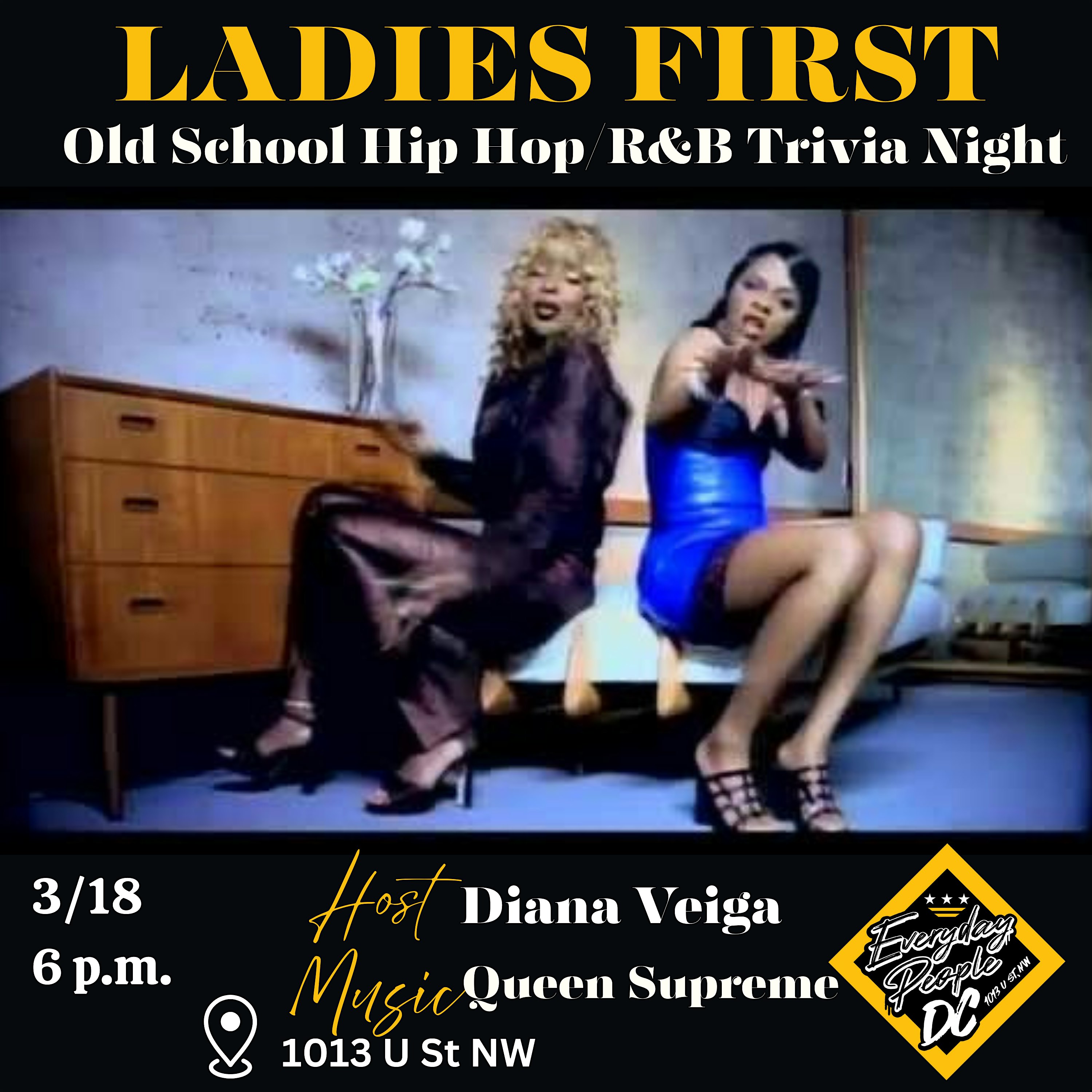 by admin27Feb LADIES FIRST OLD SCHOOL HIP HOP/R&B TRIVIA NIGHT at Everyday People DC – Washington, DC LADIES FIRST OLD SCHOOL HIP HOP/R&B TRIVIA NIGHT at Everyday People DC – Washington, DC 1 1 people viewed this event. Call your clique and come compete in old school hip hop/R&B trivia night covering the 70s-2000s. This is strictly for the aunties. Tickets-RSVP Link Date And Time Wednesday, March 18th, 2026 06:00 PM (PST) Venue Everyday People DC Location 1013 U Street Northwest, Washington, DC 20001 Event Types MusicParty or Social Gathering Event Category Washington DC Share With Friends Facebook Twitter Linkedin Xing Pinterest Share This Post: