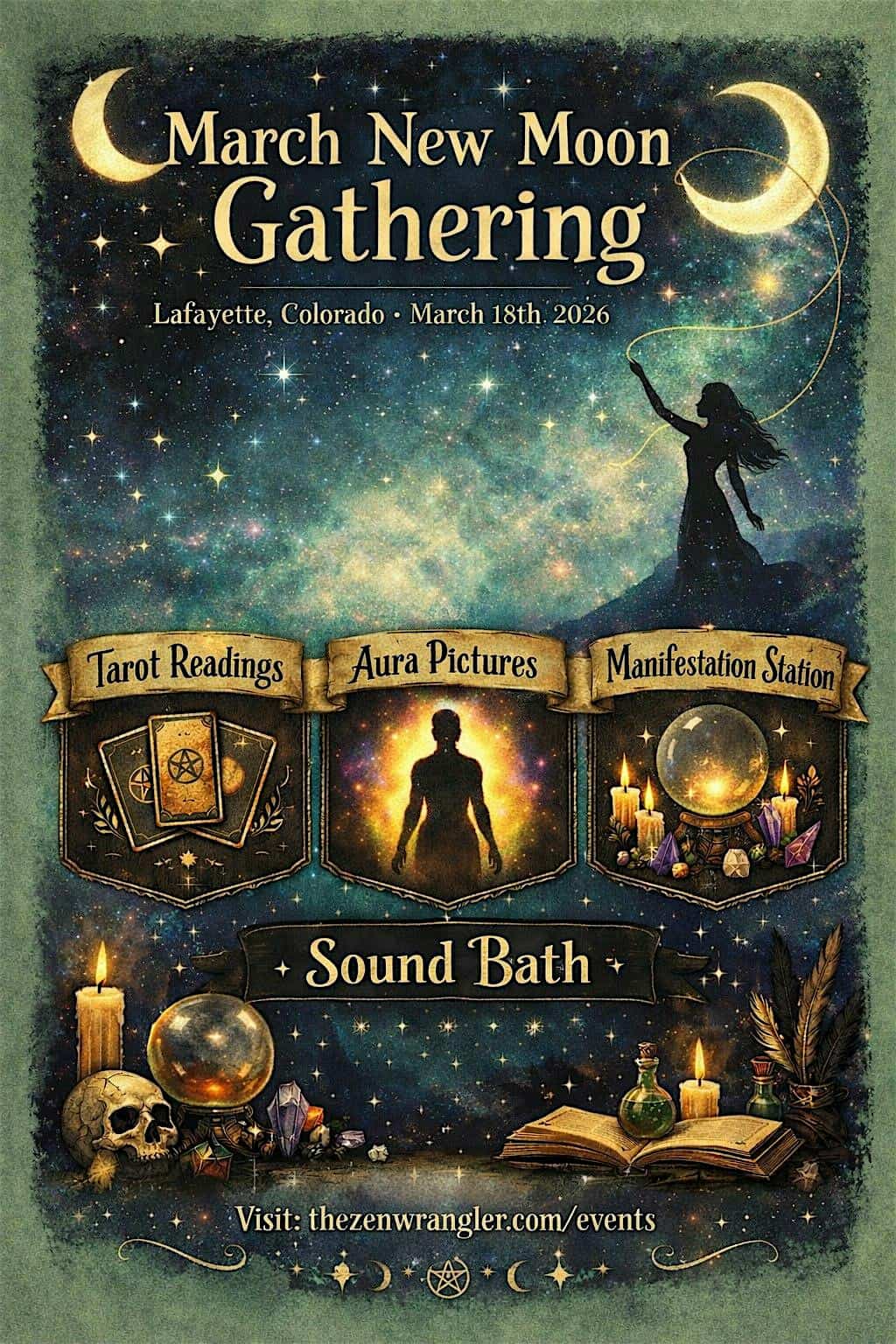 by admin23Feb March New Moon Gathering at Confluence SBC – Lafayette, CO March New Moon Gathering at Confluence SBC – Lafayette, CO 1 1 people viewed this event. March New Moon Gathering evening magic with The Zen Wrangler +Tarot, Aura Pics, Manifestation & Sound Bath. Plant the seed. Feel the shift. Tickets-RSVP Link Date And Time Wednesday, March 18th, 2026 06:00 PM (PST) Venue Confluence SBC Location 75 Waneka Parkway, Lafayette, CO 80026 Event Types Community & CultureParty or Social Gathering Event Category ColoradoDenver Share With Friends Facebook Twitter Linkedin Xing Pinterest Share This Post: