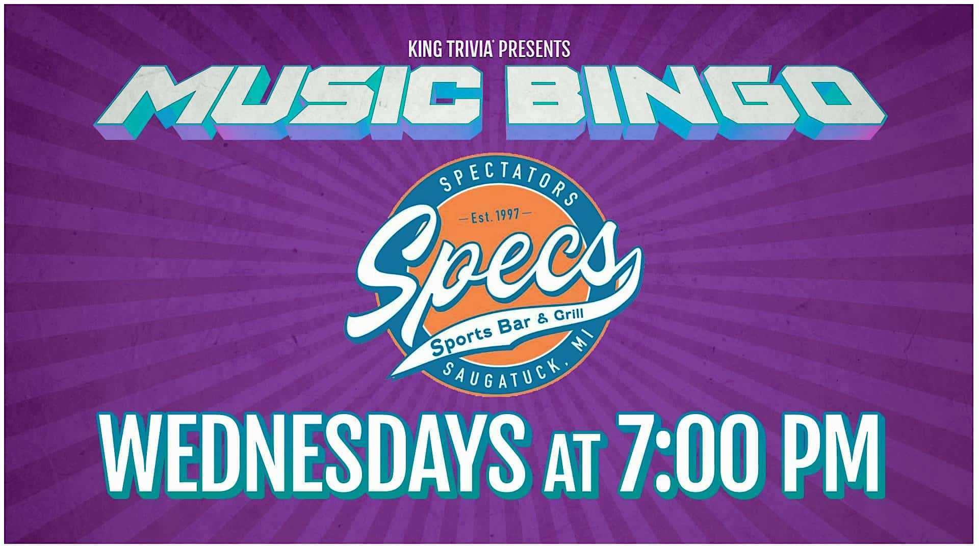 Music Bingo Night at Spectators Sports Bar & Grill at Spectators Sports Bar & Grill – Saugatuck, MI Music Bingo Night at Spectators Sports Bar & Grill at Spectators Sports Bar & Grill – Saugatuck, MI 2 2 people viewed this event. We totally invite you to sing along to your favorite songs! Win great prizes and enjoy even better company! Tickets-RSVP Link Register for event Date And Time Wednesday, March 18th, 2026 @ 07:00 PM Location 6432 Blue Star Highway, Saugatuck, MI 49453 Event Types Food & DrinkGame or Competition Event Category Michigan Share With Friends Facebook Twitter Linkedin Xing Pinterest