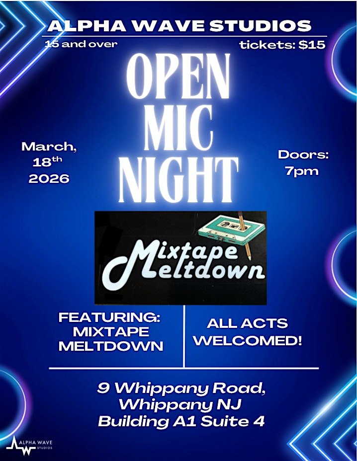 by admin05Mar Open Mic Night @ Alpha Wave Studios! at Alpha Wave Studios – Hanover, NJ Open Mic Night @ Alpha Wave Studios! at Alpha Wave Studios – Hanover, NJ 1 1 people viewed this event. Open Mic Night @ Alpha Wave Studios! Tickets-RSVP Link Date And Time Wednesday, March 18th, 2026 07:00 PM (PST) Venue Alpha Wave Studios Location 9 Whippany Road, Hanover, NJ 7981 Event Types Concert or PerformanceMusic Event Category New Jersey Share With Friends Facebook Twitter Linkedin Xing Pinterest Share This Post: