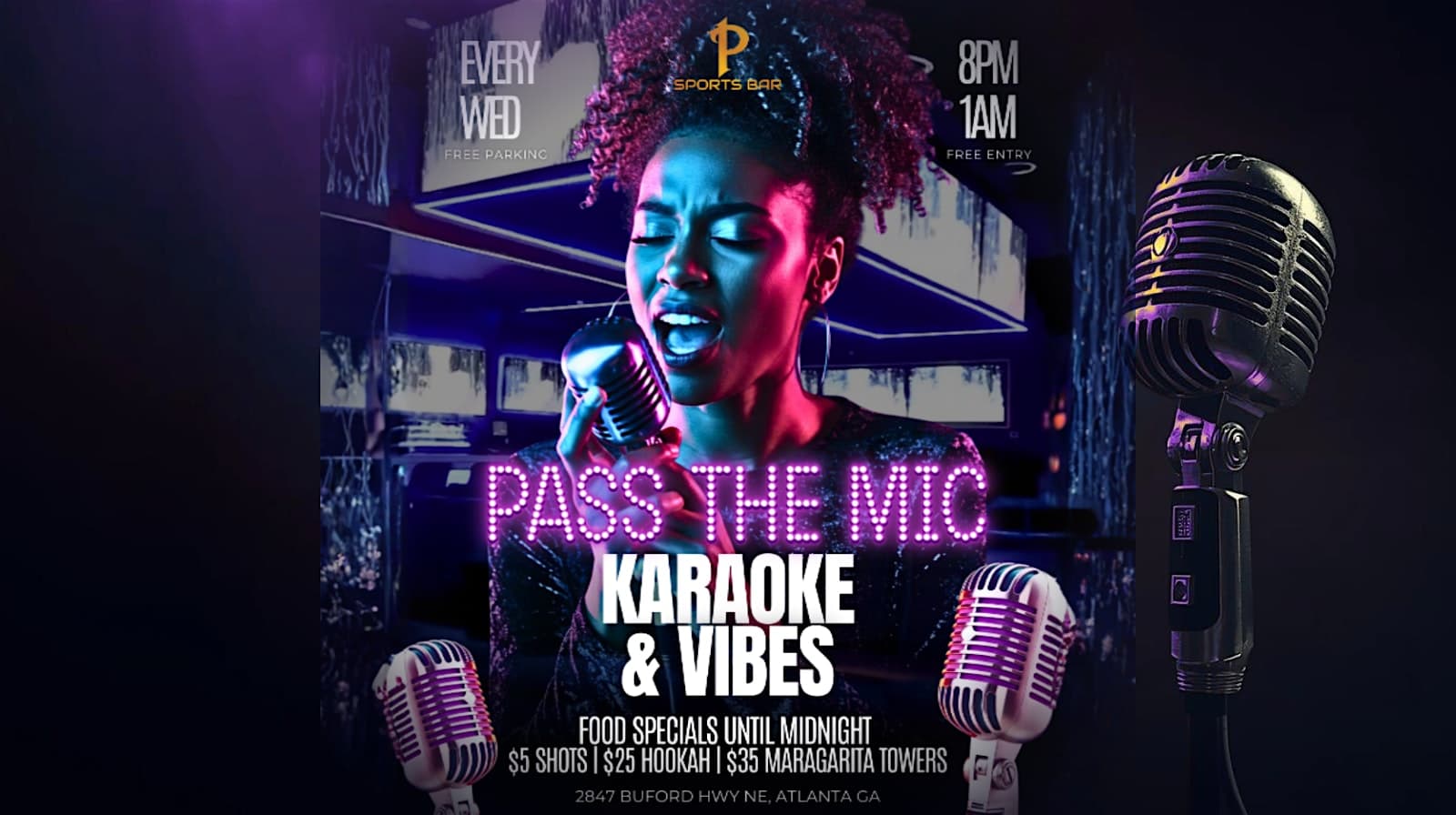 Pass The Mic: Karaoke & Vibes at P Sports Bar – Atlanta, GA Pass The Mic: Karaoke & Vibes at P Sports Bar – Atlanta, GA 3 3 people viewed this event. Your midweek move to steal the spotlight and sing your heart out while enjoying the best specials on a Wednesday! Karaoke | Vibes | Sports Tickets-RSVP Link Register for event Date And Time Wednesday, March 18th, 2026 @ 09:00 PM Location 2847 Buford Highway Northeast, Atlanta, GA 30329 Event Types MusicParty or Social Gathering Event Category AtlantaGeorgia Share With Friends Facebook Twitter Linkedin Xing Pinterest