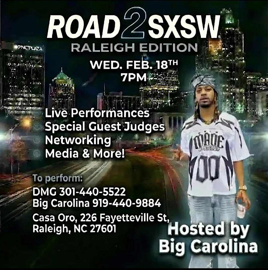 by admin13Feb ROAD 2 SXSW RALEIGH EDITION at 226 Fayetteville St – Raleigh, NC ROAD 2 SXSW RALEIGH EDITION at 226 Fayetteville St – Raleigh, NC 1 1 people viewed this event. Here’s your chance to perform at SXSW! Tickets-RSVP Link Date And Time Wednesday, March 18th, 2026 11:00 PM (PST) Venue 226 Fayetteville St Location 226 Fayetteville Street, Raleigh, NC 27601 Event Types Music Event Category North CarolinaRaleigh Share With Friends Facebook Twitter Linkedin Xing Pinterest Share This Post: