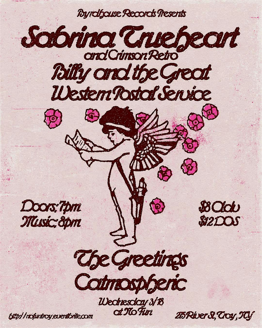 by admin13Feb Sabrina Trueheart & Crimson Retro/Billy & TGWPS/The Greetings/Catmospheric at No Fun – Troy, NY Sabrina Trueheart & Crimson Retro/Billy & TGWPS/The Greetings/Catmospheric at No Fun – Troy, NY 1 1 people viewed this event. Byrdhouse Records presents Sabrina Trueheart & Crimson Retro, Billy & TGWPS, The Greetings, and Catmospheric at No Fun on Wednesday 3/18! Tickets-RSVP Link Date And Time Wednesday, March 18th, 2026 11:00 PM (PST) Venue No Fun Location 275 River Street, Troy, NY 12180 Event Types Concert or PerformanceMusic Event Category New York Share With Friends Facebook Twitter Linkedin Xing Pinterest Share This Post: