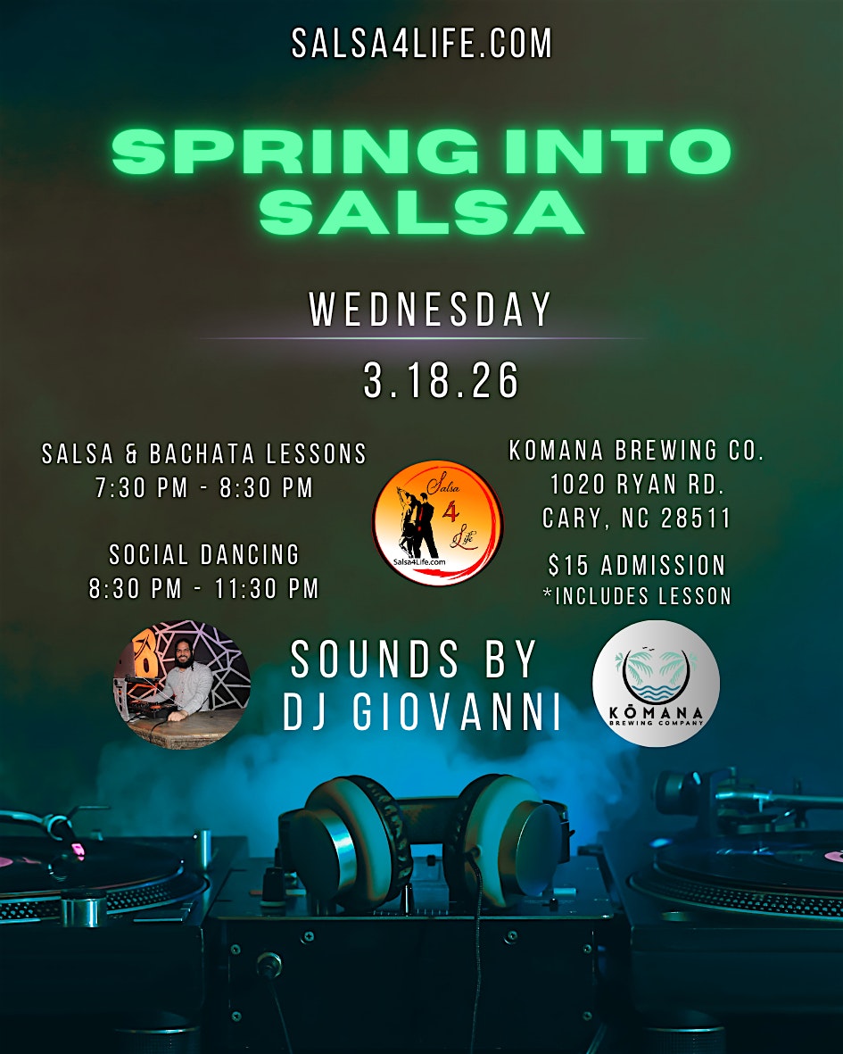 by admin27Feb Salsa Madness – Salsa4Life Dance Party at KōMANA Brewing Company – Cary, NC Salsa Madness – Salsa4Life Dance Party at KōMANA Brewing Company – Cary, NC 1 1 people viewed this event. Get ready to spice up your Wednesday night with salsa dancing and lessons! Tickets-RSVP Link Date And Time Wednesday, March 18th, 2026 @ 07:00 PM Location 1020 Ryan Road, Cary, NC 27511 Event Types Party or Social GatheringPerforming & Visual Arts Event Category North Carolina Share With Friends Facebook Twitter Linkedin Xing Pinterest Share This Post:
