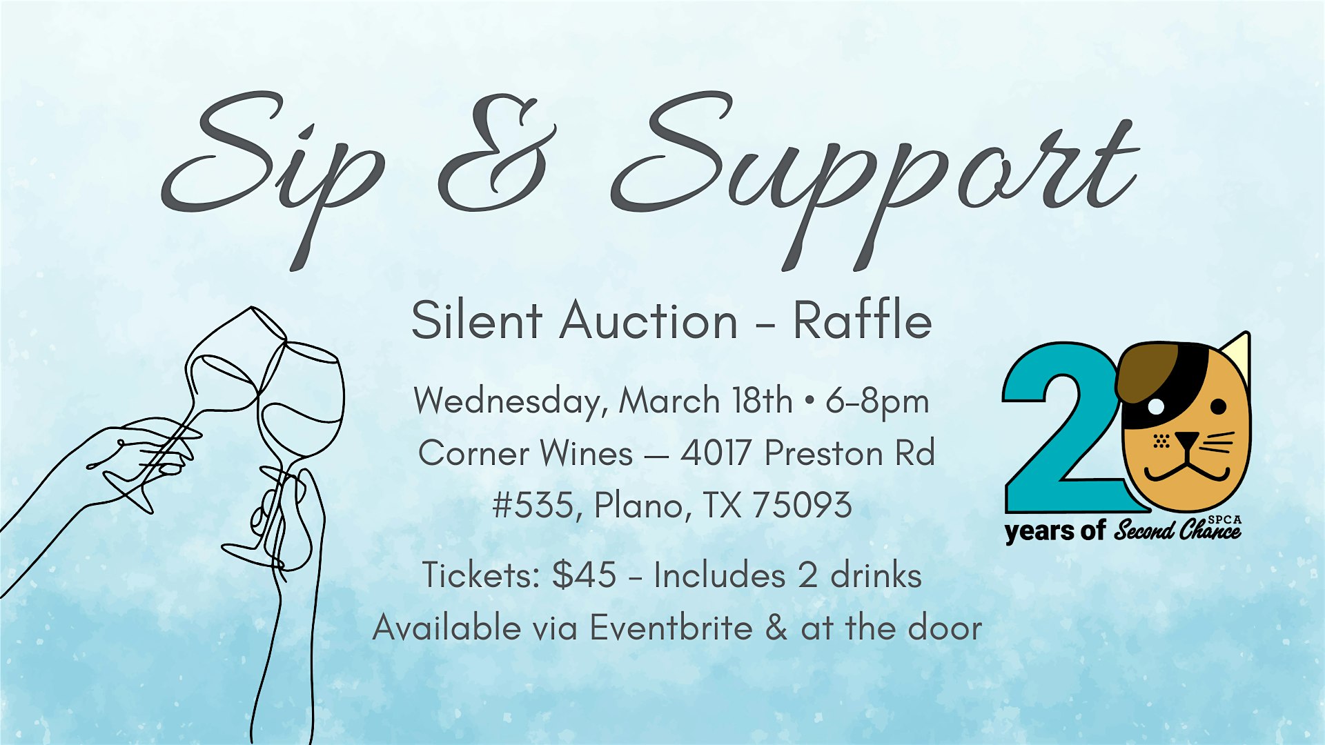 by admin13Feb Second Chance SPCA 20th Anniversary at Corner Wines & Wine Bar – Plano, TX Second Chance SPCA 20th Anniversary at Corner Wines & Wine Bar – Plano, TX 1 1 people viewed this event. This event will feature curated wines, light snacks, raffle and a silent auction, with all proceeds continuing to support our mission. Tickets-RSVP Link Date And Time Wednesday, March 18th, 2026 11:00 PM (PST) Venue Corner Wines & Wine Bar Location 4017 Preston Road, Plano, TX 75093 Event Types Charity & CausesParty or Social Gathering Event Category DallasTexas Share With Friends Facebook Twitter Linkedin Xing Pinterest Share This Post: