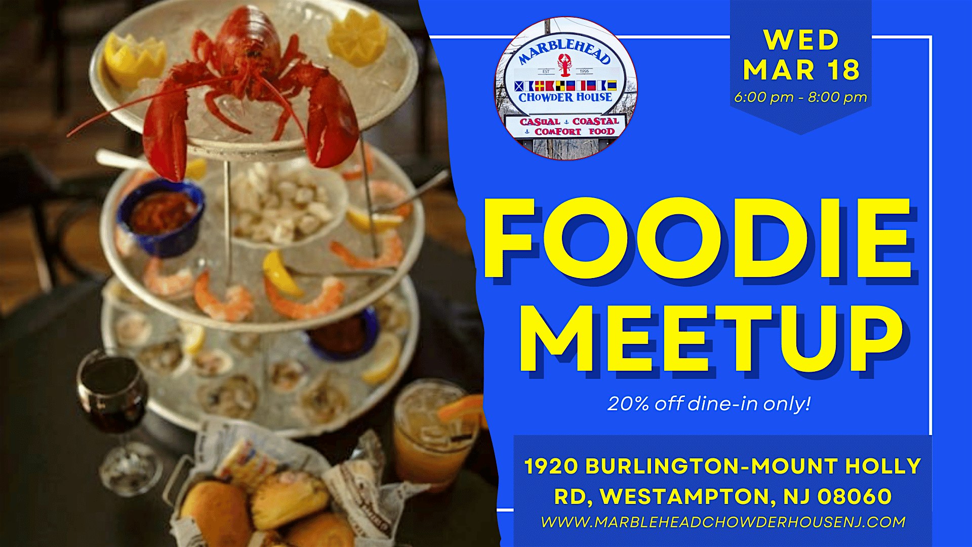 by admin05Mar South Jersey Foodie Night at Marblehead Chowder House in Westampton at 1920 Burlington-Mount Holly Rd – Westampton Township, NJ South Jersey Foodie Night at Marblehead Chowder House in Westampton at 1920 Burlington-Mount Holly Rd – Westampton Township, NJ 2 2 people viewed this event. Join us for a discounted dinner experience at Marblehead Chowder House. Tickets-RSVP Link Date And Time Wednesday, March 18th, 2026 06:00 PM (PST) Venue 1920 Burlington-Mount Holly Rd Location 1920 Burlington - Mount Holly Road, Westampton Township, NJ 8060 Event Types Food & Drink Event Category New Jersey Share With Friends Facebook Twitter Linkedin Xing Pinterest Share This Post:
