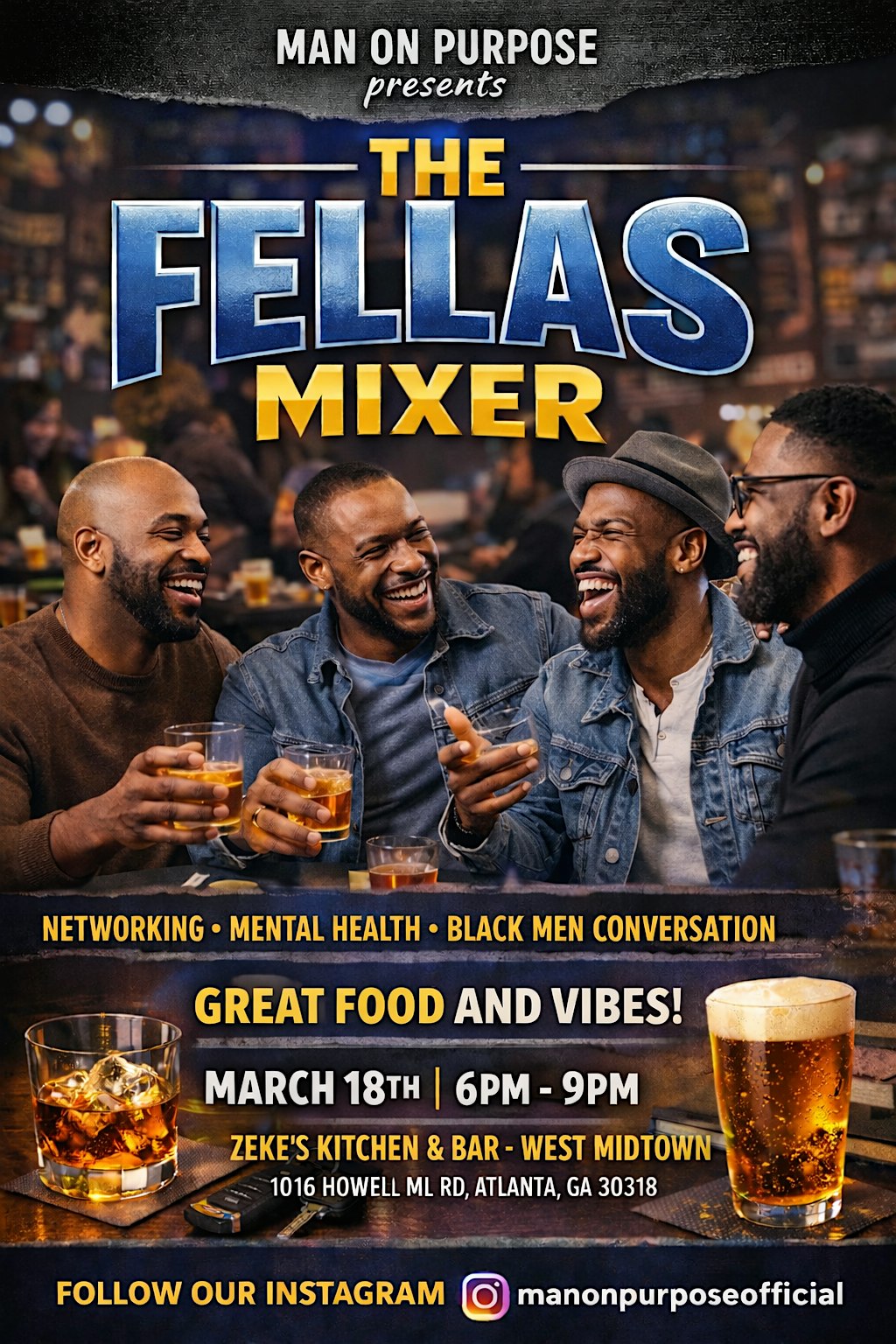 by admin05Mar THE FELLAS MIXER at Zeke’s Kitchen & Bar – West Midtown – Atlanta, GA THE FELLAS MIXER at Zeke’s Kitchen & Bar – West Midtown – Atlanta, GA 2 2 people viewed this event. The Fellas Mixer is a monthly networking event for black men in Atlanta. We talk about the ways we can grow, we drink, we eat & we build. Tickets-RSVP Link Date And Time Wednesday, March 18th, 2026 06:00 PM (PST) Venue Zeke's Kitchen & Bar - West Midtown Location 1016 Howell Mill Road, Atlanta, GA 30318 Event Types Food & Drink Event Category AtlantaGeorgia Share With Friends Facebook Twitter Linkedin Xing Pinterest Share This Post: