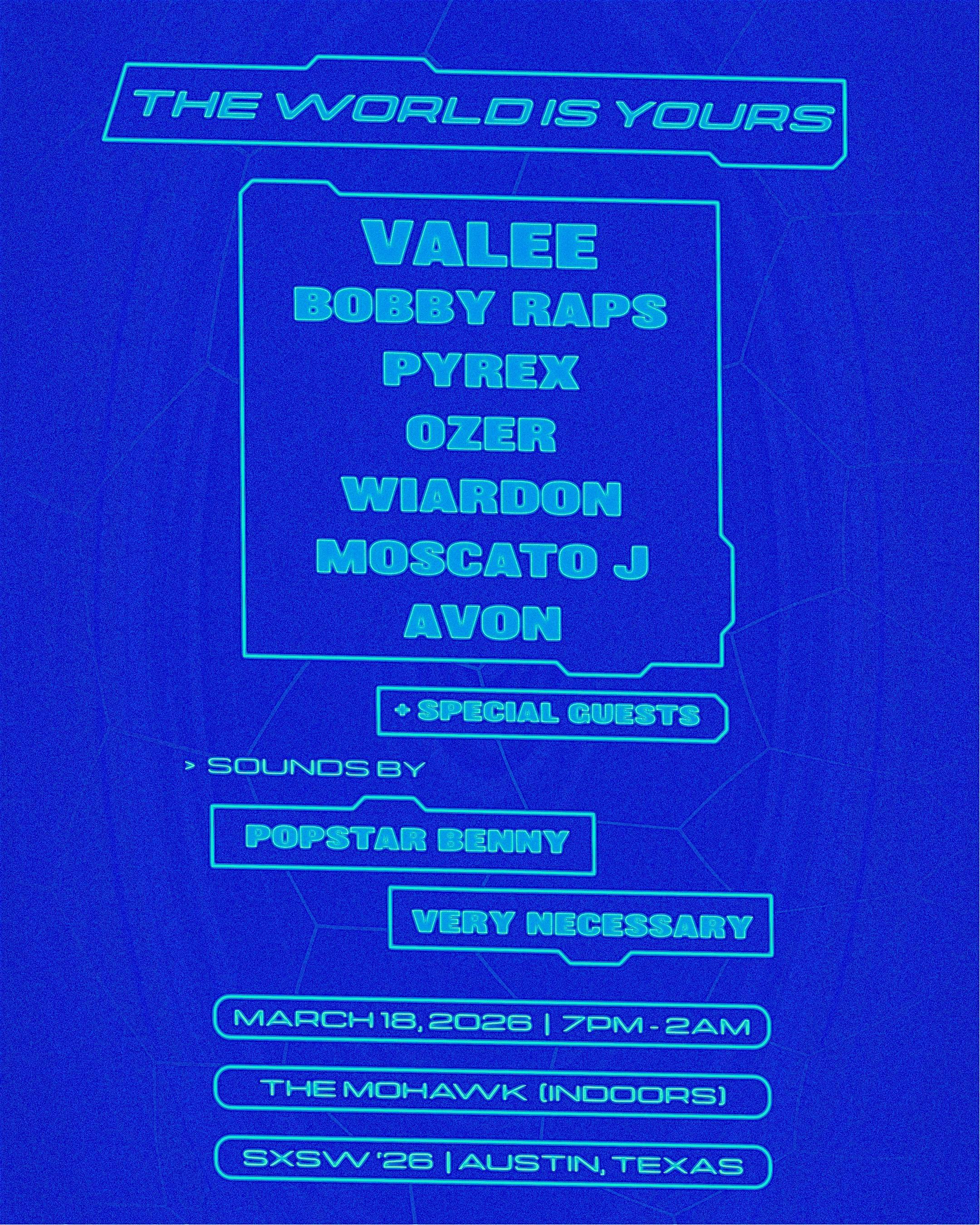 by admin05Mar Very Necessary Presents: “The World Is Yours” Official SXSW Showcase at Mohawk Austin – Austin, TX Very Necessary Presents: “The World Is Yours” Official SXSW Showcase at Mohawk Austin – Austin, TX 2 2 people viewed this event. Very Necessary presents an SXSW showcase at Mohawk on March 18, 2026—curated live performances + industry/fan connection. 7PM–2AM. Tickets-RSVP Link Date And Time Wednesday, March 18th, 2026 07:00 PM (PST) Venue Mohawk Austin Location 912 Red River Street, Austin, TX 78701 Event Types Concert or PerformanceMusic Event Category AustinTexas Share With Friends Facebook Twitter Linkedin Xing Pinterest Share This Post:
