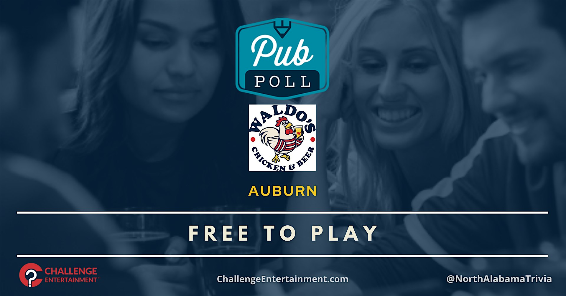 Weekly Pub Poll Game Nights at Waldo’s Chicken & Beer – Auburn at Waldo’s Chicken & Beer – Auburn, AL Weekly Pub Poll Game Nights at Waldo’s Chicken & Beer – Auburn at Waldo’s Chicken & Beer – Auburn, AL 2 2 people viewed this event. Weekly Pub Poll Game Nights at Waldo’s Chicken & Beer – Auburn Tickets-RSVP Link Register for event Date And Time Wednesday, March 18th, 2026 @ 06:00 PM Location 1120 South College Street, Auburn, AL 36832 Event Types Food & DrinkGame or Competition Event Category Alabama Share With Friends Facebook Twitter Linkedin Xing Pinterest
