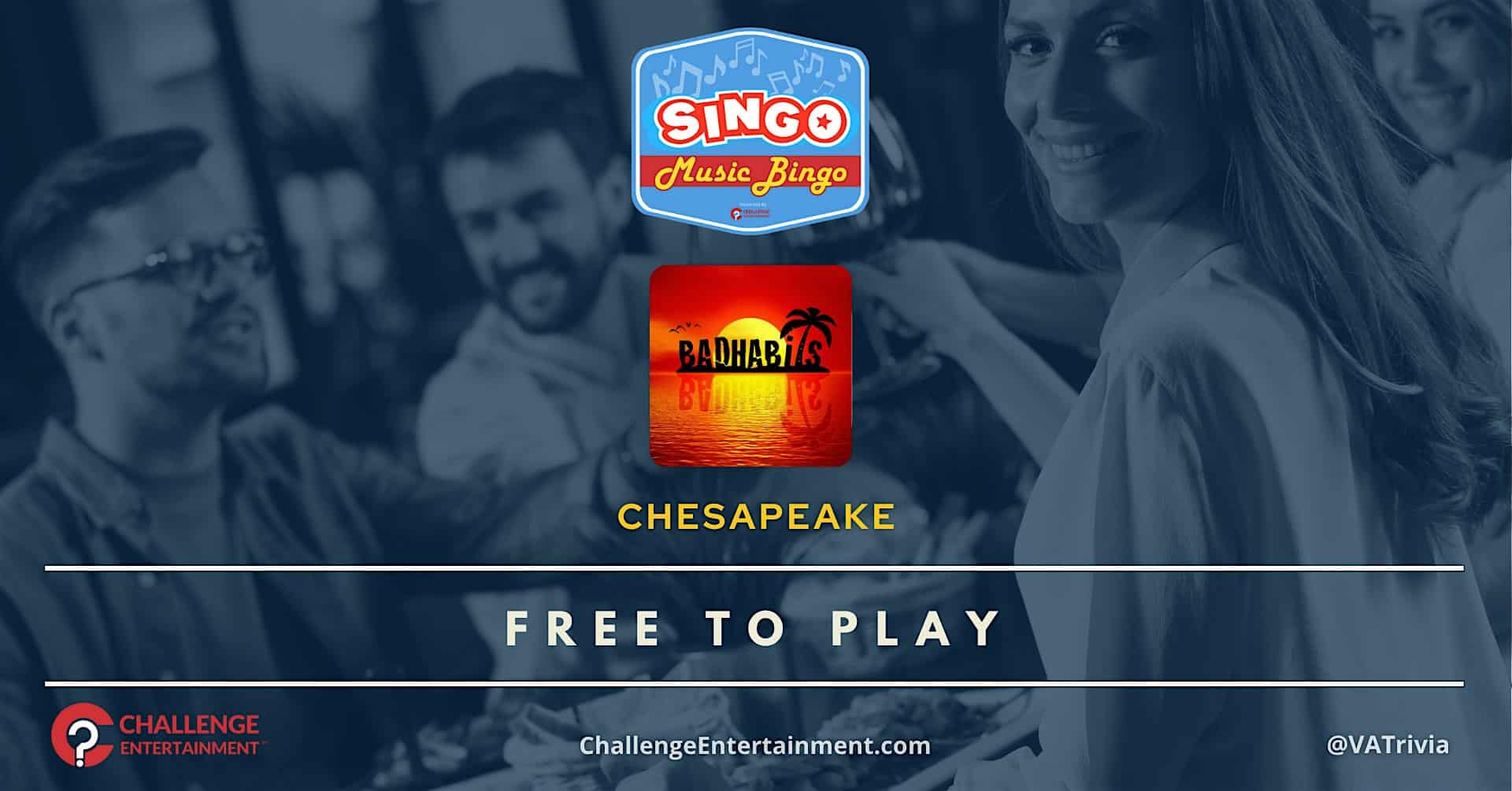 Weekly SINGO Music Bingo at Bad Habits Wing & Oyster Bar – Chesapeake at Bad Habits – Chesapeake, VA Weekly SINGO Music Bingo at Bad Habits Wing & Oyster Bar – Chesapeake at Bad Habits – Chesapeake, VA 4 4 people viewed this event. SINGO Music Bingo at Bad Habits Wing & Oyster Bar – Weds 7PM Tickets-RSVP Link Register for event Date And Time Wednesday, March 18th, 2026 @ 07:00 PM Location 1464 Mount Pleasant Road, Chesapeake, VA 23322 Event Types Food & DrinkGame or Competition Event Category NorfolkVirginia Share With Friends Facebook Twitter Linkedin Xing Pinterest