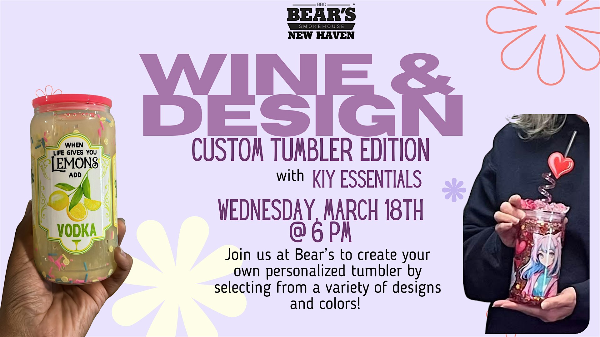 by admin05Mar Wine & Design – Custom Tumblers Class at Bear’s Smokehouse Barbecue – New Haven, CT Wine & Design – Custom Tumblers Class at Bear’s Smokehouse Barbecue – New Haven, CT 2 2 people viewed this event. Join us for a fun night crafting your own custom tumblers with KIY Essentials! Tickets-RSVP Link Date And Time Wednesday, March 18th, 2026 06:00 PM (PST) Venue Bear's Smokehouse Barbecue Location 470 James Street, New Haven, CT 6513 Event Types Food & Drink Event Category Connecticut Share With Friends Facebook Twitter Linkedin Xing Pinterest Share This Post: