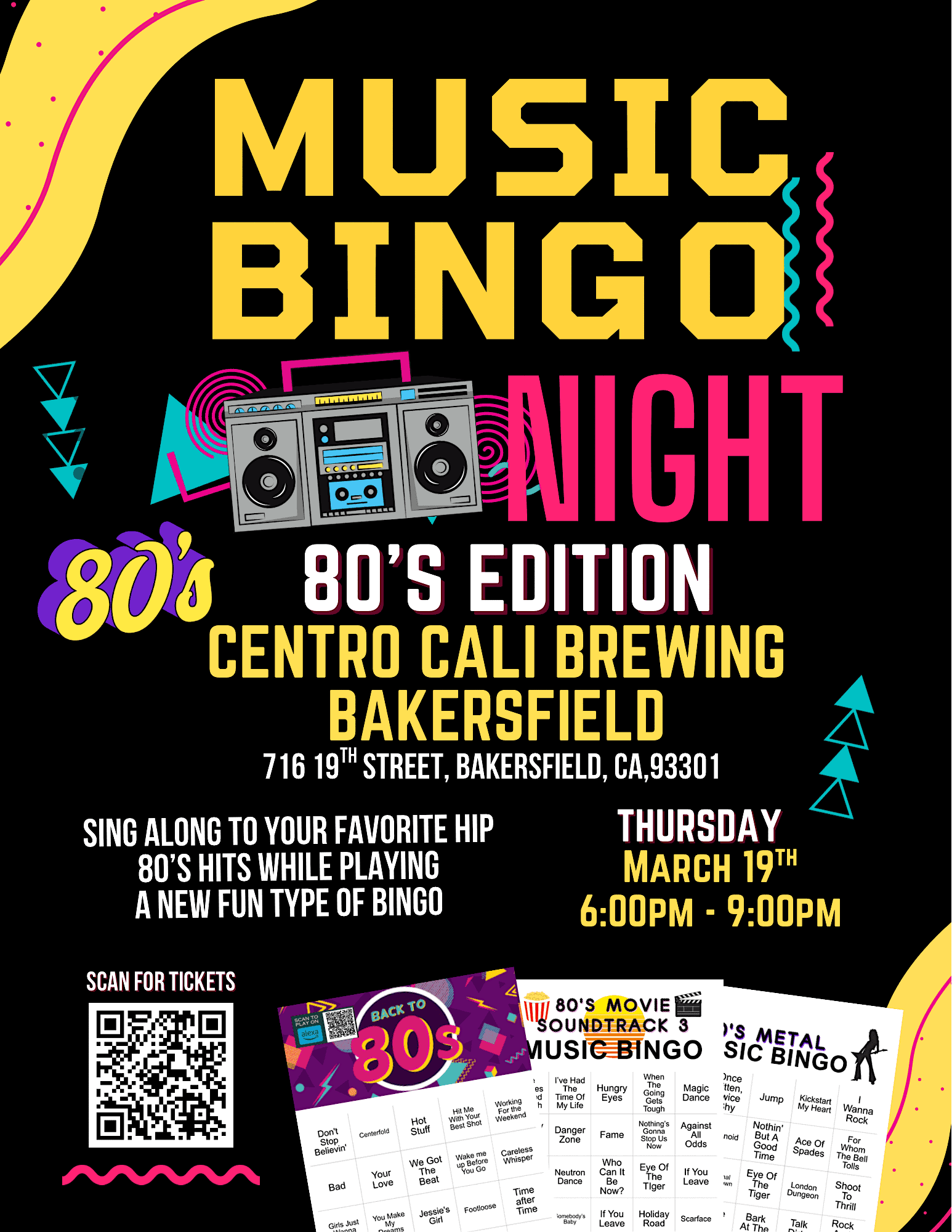 by admin23Feb 80’s Music Bingo Night@ Centro Cali Brewing at Centro Cali Brewing | Bakersfield Craft Brewery & Restaurant – Bakersfield, CA 80’s Music Bingo Night@ Centro Cali Brewing at Centro Cali Brewing | Bakersfield Craft Brewery & Restaurant – Bakersfield, CA 1 1 people viewed this event. Hey Music Bingoers! 80’s Music Bingo Night is coming to Bakersfield Thursday Night March 19th at Centro Cali Brewing. Tickets-RSVP Link Date And Time Thursday, March 19th, 2026 @ 06:00 PM Location 716 19th Street, Bakersfield, CA 93301 Event Types MusicParty or Social Gathering Event Category California Share With Friends Facebook Twitter Linkedin Xing Pinterest Share This Post:
