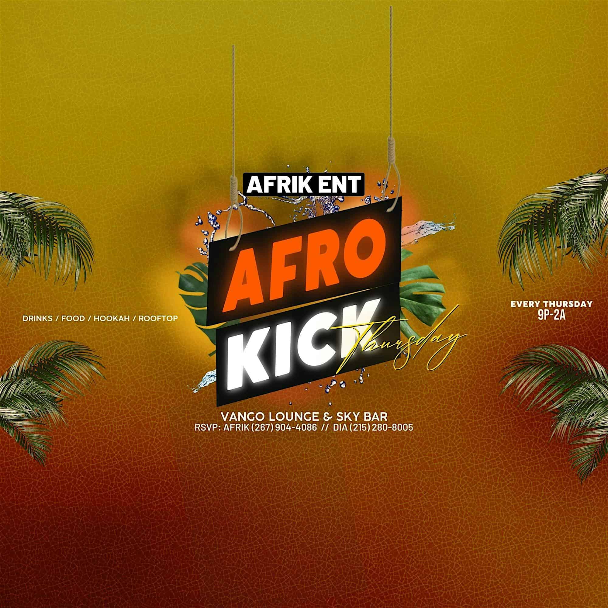 by admin23Feb AFRO KICK THURSDAY at Vango Lounge and Skybar – Philadelphia, PA AFRO KICK THURSDAY at Vango Lounge and Skybar – Philadelphia, PA 1 1 people viewed this event. Join us every Thursday at Vango Lounge & Sky Bar for a curated ambiance of Afro-Caribbean music mixed by DJ Afrik & Guest Djs! Tickets-RSVP Link Date And Time Thursday, March 19th, 2026 09:00 PM (PST) Venue Vango Lounge and Skybar Location 116 South 18th Street, Philadelphia, PA 19103 Event Types MusicParty or Social Gathering Event Category PennsylvaniaPhiladelphia Share With Friends Facebook Twitter Linkedin Xing Pinterest Share This Post: