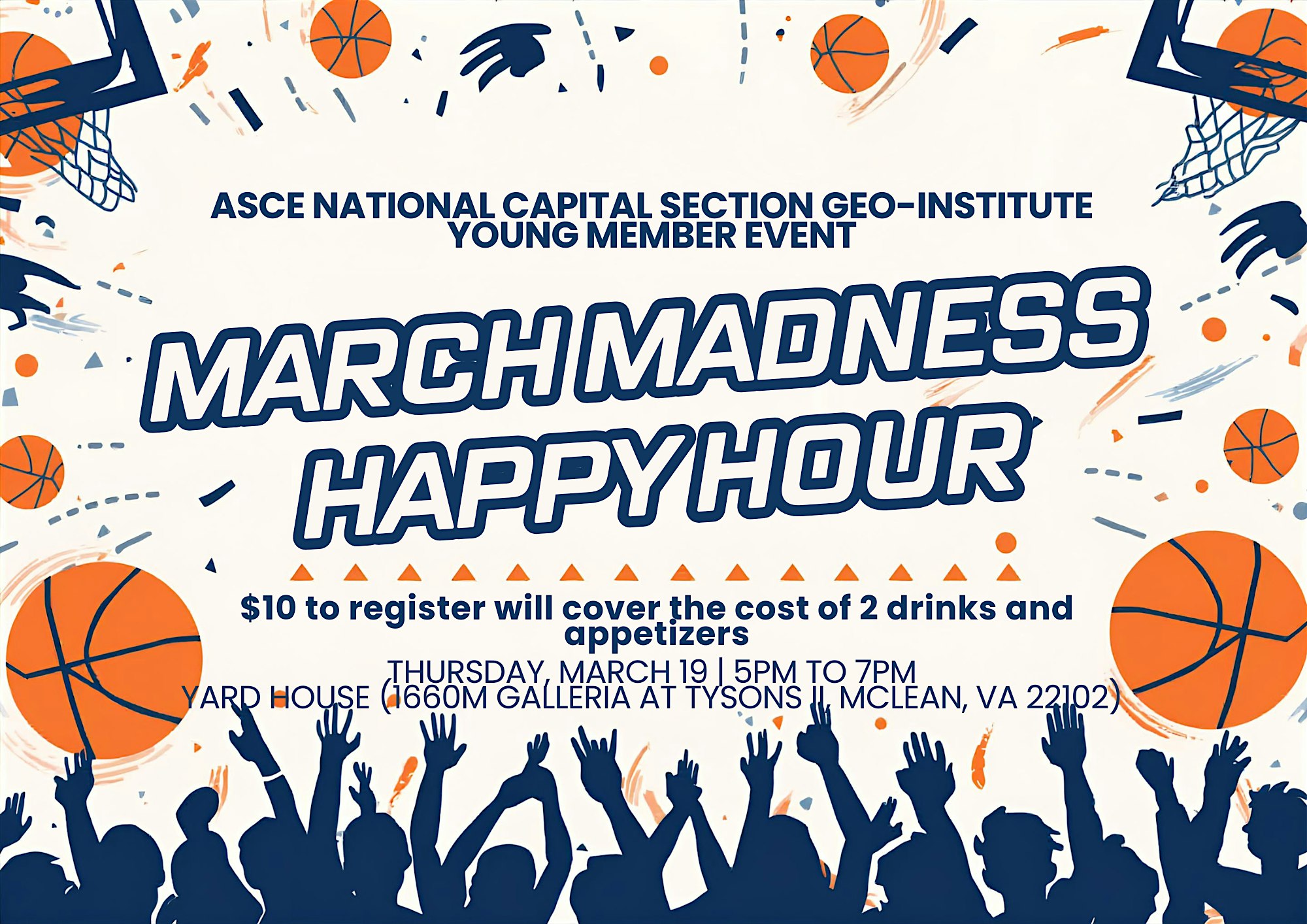 by admin13Feb ASCE Young Member March Madness Happy Hour at Yard House – McLean, VA ASCE Young Member March Madness Happy Hour at Yard House – McLean, VA 1 1 people viewed this event. Join the ASCE NCS G-I younger members for a happy hour event on Thursday March 19th! Members of all ages are welcome! Tickets-RSVP Link Date And Time Thursday, March 19th, 2026 09:00 PM (PST) Venue Yard House Location 1660M Galleria at Tysons II, McLean, VA 22102 Event Types Community & CultureParty or Social Gathering Event Category Virginia Share With Friends Facebook Twitter Linkedin Xing Pinterest Share This Post: