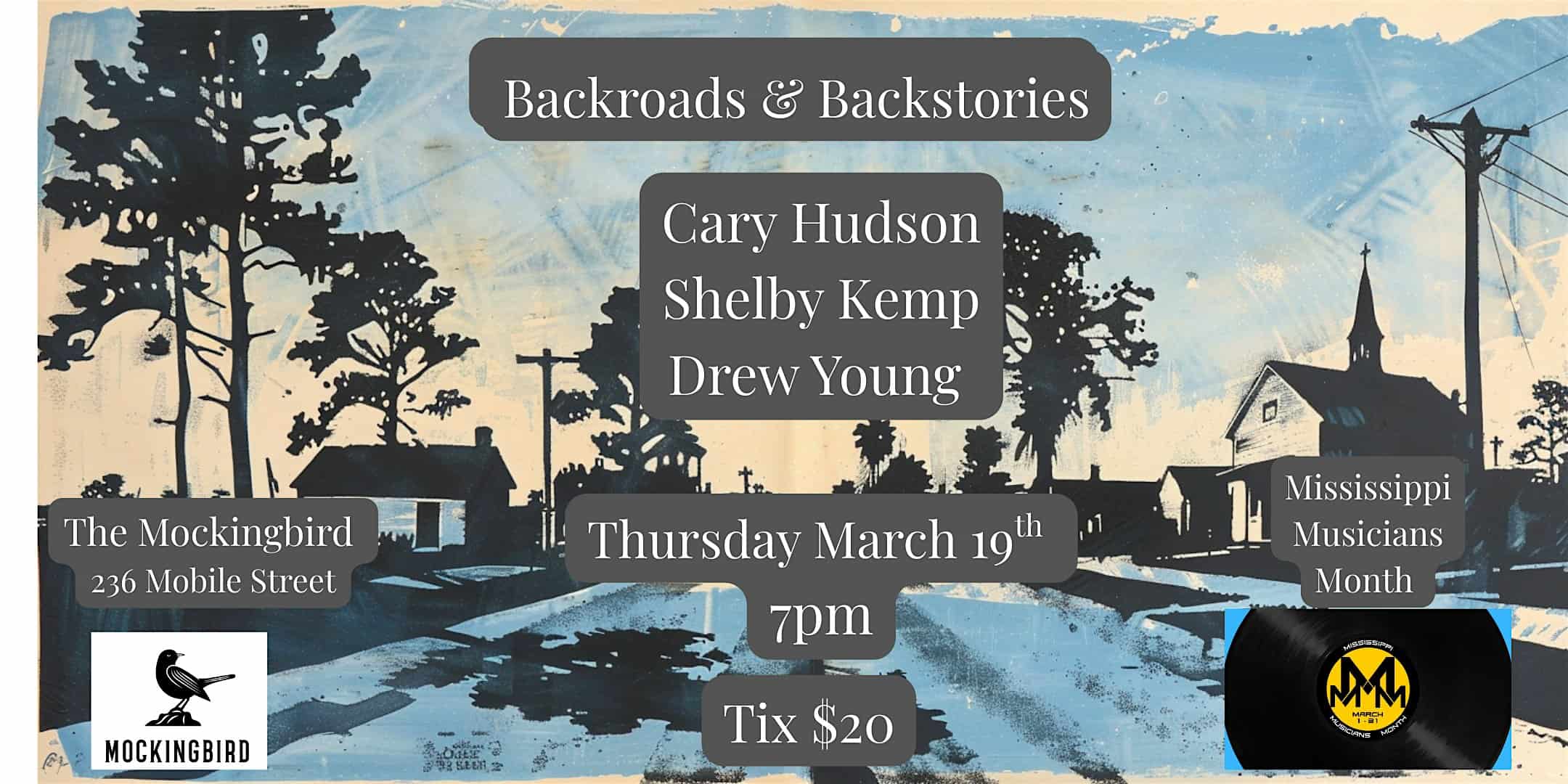 by admin23Feb Back Roads & Back Stories w/ Cary Hudson, Shelby Kemp & Drew Young at The Mockingbird – Hattiesburg, MS Back Roads & Back Stories w/ Cary Hudson, Shelby Kemp & Drew Young at The Mockingbird – Hattiesburg, MS 2 2 people viewed this event. Backroads and Backstories celebrates Mississippi songwriters, listening room culture, and Hattiesburg’s commitment to song craft and music Tickets-RSVP Link Date And Time Thursday, March 19th, 2026 07:00 PM (PST) Venue The Mockingbird Location 236 Mobile Street, Hattiesburg, MS 39401 Event Types Concert or PerformanceMusic Event Category Mississippi Share With Friends Facebook Twitter Linkedin Xing Pinterest Share This Post: