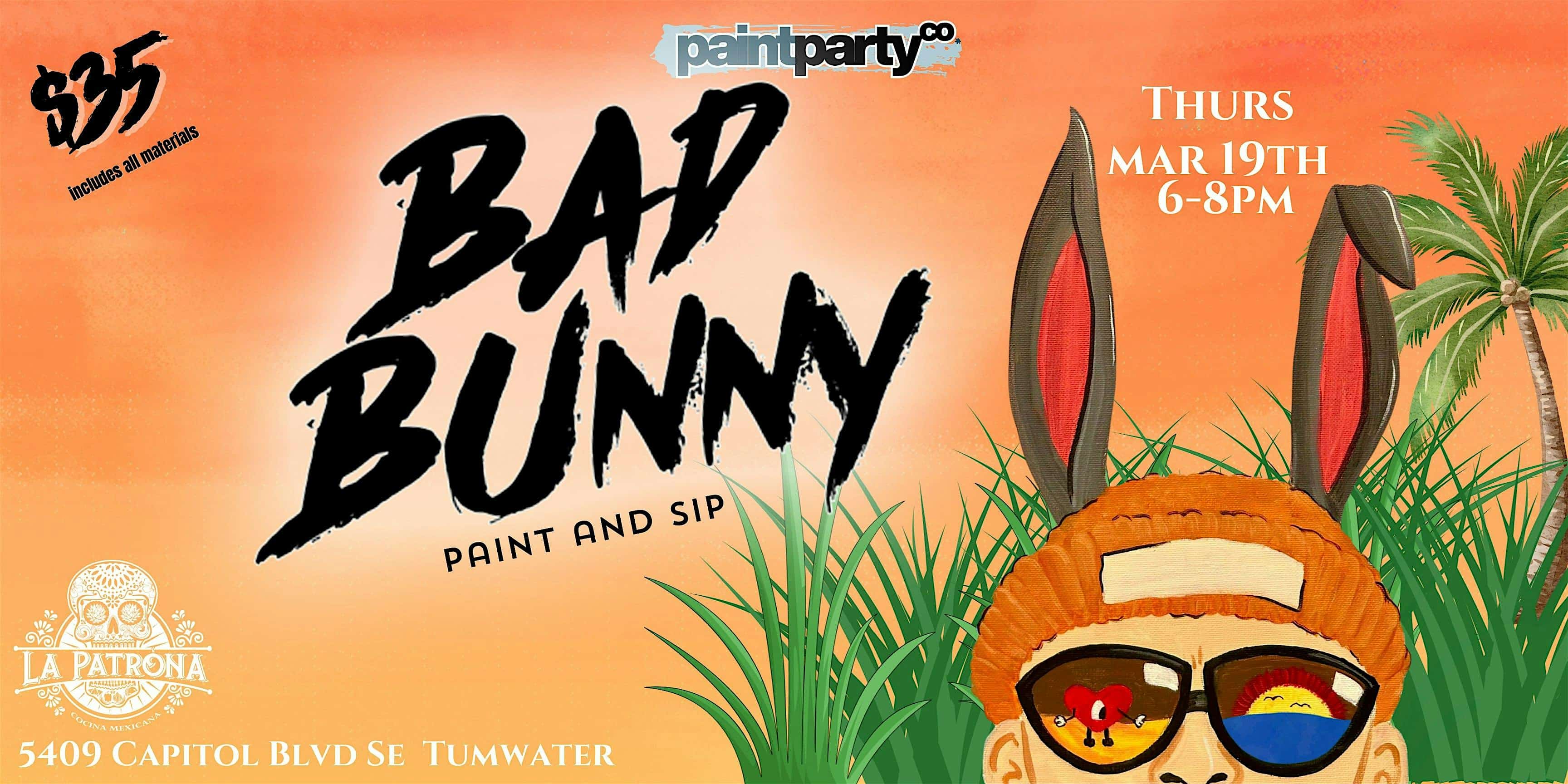 by admin23Feb Bad Bunny Paint & Sip at La Patrona – Tumwater, WA Bad Bunny Paint & Sip at La Patrona – Tumwater, WA 1 1 people viewed this event. Bad Bunny inspired Paint & Sip night! Paint, sip, and vibe to Bad Bunny hits. All supplies included. No experience needed. Benito love! Tickets-RSVP Link Date And Time Thursday, March 19th, 2026 06:00 PM (PST) Venue La Patrona Location 5409 Capitol Boulevard South, Tumwater, WA 98501 Event Types Party or Social GatheringPerforming & Visual Arts Event Category Washington Share With Friends Facebook Twitter Linkedin Xing Pinterest Share This Post: