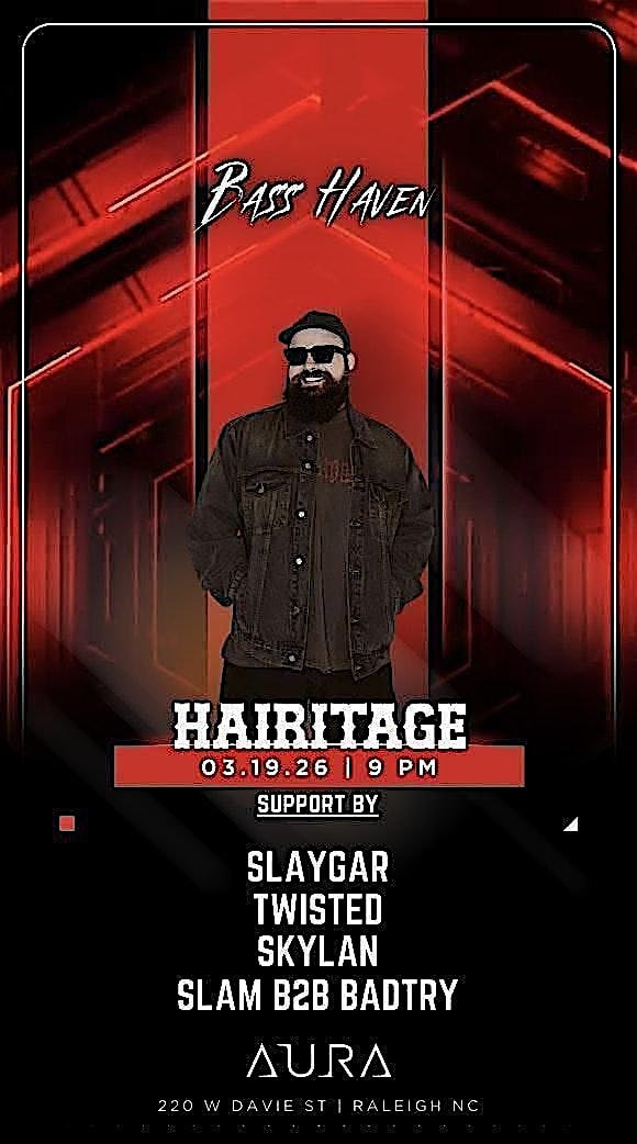by admin23Feb Bass Haven: Hairitage at Aura Lounge&Nightclub – Raleigh, NC Bass Haven: Hairitage at Aura Lounge&Nightclub – Raleigh, NC 1 1 people viewed this event. Hairitage @ Aura, 3/19. Dubstep / Bass. Tickets-RSVP Link Date And Time Thursday, March 19th, 2026 09:00 PM (PST) Venue Aura Lounge&Nightclub Location 220 West Davie Street, Raleigh, NC 27601 Event Types Concert or PerformanceMusic Event Category North CarolinaRaleigh Share With Friends Facebook Twitter Linkedin Xing Pinterest Share This Post: