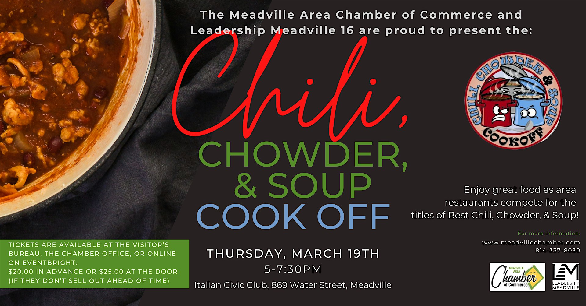 by admin27Feb Chili, Chowder & Soup Cookoff at Italian Civic Club – Meadville, PA Chili, Chowder & Soup Cookoff at Italian Civic Club – Meadville, PA 1 1 people viewed this event. The “hottest” ticket in town! Try the delicious entries from up to 20 Crawford County eateries & caterers all in one location. Tickets-RSVP Link Date And Time Thursday, March 19th, 2026 @ 05:00 PM Location 869 Water Street, Meadville, PA 16335 Event Types Food & DrinkParty or Social Gathering Event Category Pennsylvania Share With Friends Facebook Twitter Linkedin Xing Pinterest Share This Post: