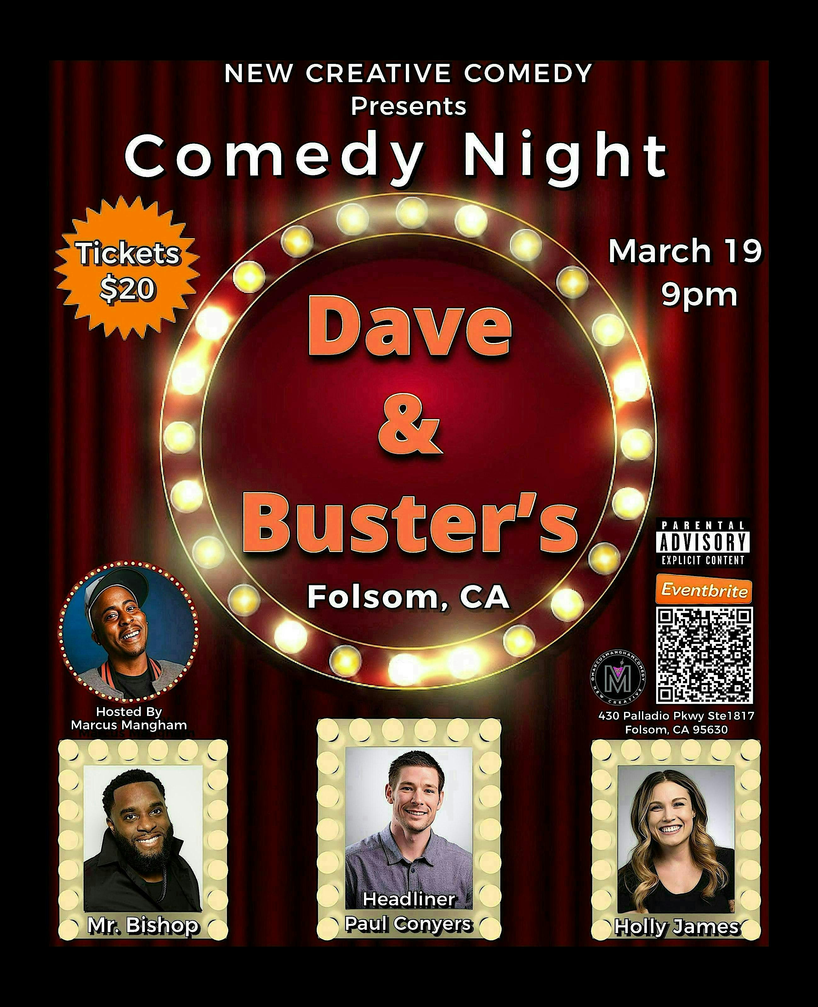 by admin05Mar Comedy Night at Dave & Buster’s – Folsom at Dave & Buster’s Folsom – Folsom, CA Comedy Night at Dave & Buster’s – Folsom at Dave & Buster’s Folsom – Folsom, CA 1 1 people viewed this event. New late night stand-up comedy at Dave and Buster’s Folsom with rotating headliners, hosted by Marcus Mangham. Tickets-RSVP Link Date And Time Thursday, March 19th, 2026 09:00 PM (PST) Venue Dave & Buster's Folsom Location 430 Palladio Parkway, Folsom, CA 95630 Event Types Concert or PerformancePerforming & Visual Arts Event Category CaliforniaSacramento Share With Friends Facebook Twitter Linkedin Xing Pinterest Share This Post: