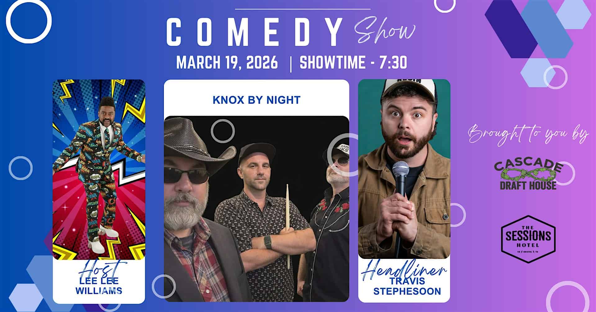 by admin05Mar Comedy Night w/ Travis Stepheson, Knox by Night and Host Lee Lee Williams at Cascade Draft House – Bristol, TN Comedy Night w/ Travis Stepheson, Knox by Night and Host Lee Lee Williams at Cascade Draft House – Bristol, TN 6 6 people viewed this event. Travis Stephenson headlines with Knox by Night and host Lee Lee Williams—your ticket includes two draft beverages for a night of big laughs. Tickets-RSVP Link Date And Time Thursday, March 19th, 2026 07:00 PM (PDT) Venue Cascade Draft House Location 828 State Street, Bristol, TN 37620 Event Types Concert or PerformancePerforming & Visual Arts Event Category Tennessee Share With Friends Facebook Twitter Linkedin Xing Pinterest Share This Post:
